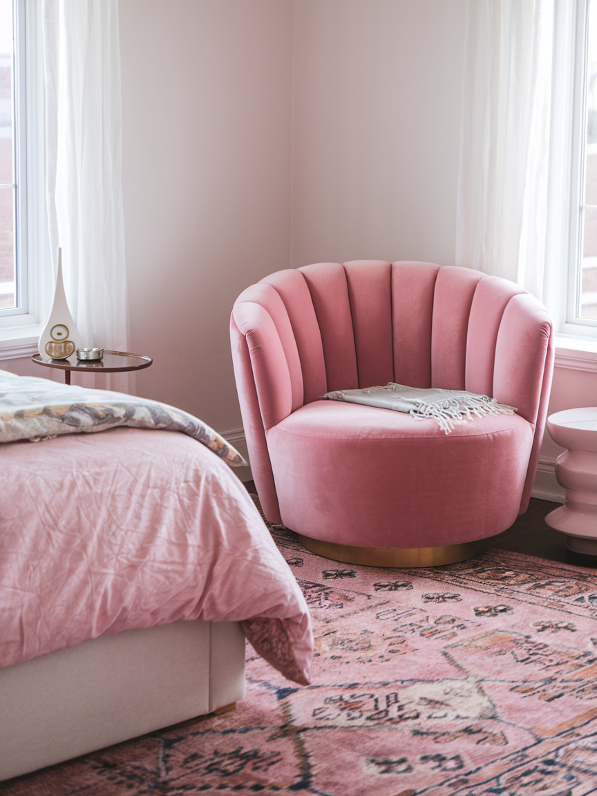 Transform a quiet corner into a cozy pink reading nook by layering soft textures and gentle lighting. Use a comfortable chair or floor cushions in blush tones, add a small side table, and include a warm lamp for evening relaxation. Incorporate a soft throw and a few decorative pillows to enhance comfort. This dedicated space encourages rest and quiet time while adding visual interest to the room. The soft pink palette keeps the nook feeling calm and inviting, making it a perfect retreat within your bedroom.