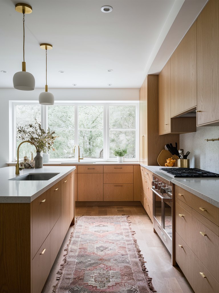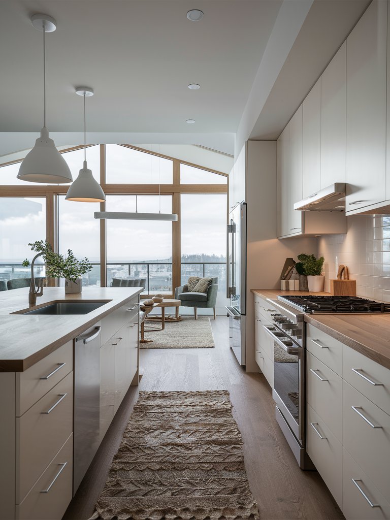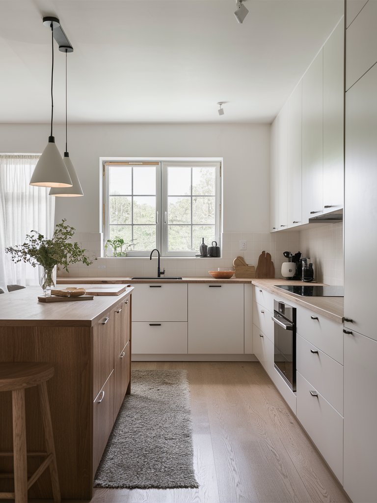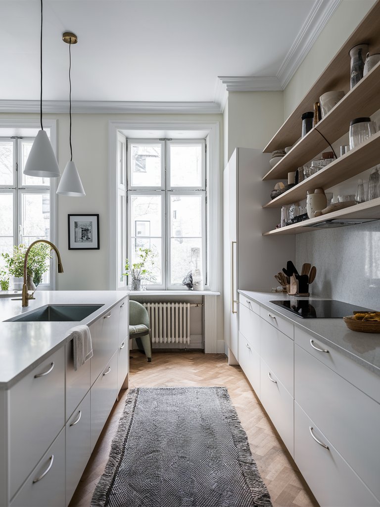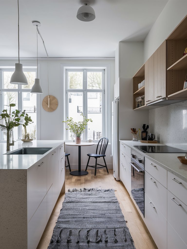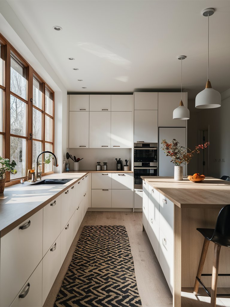 Despite its minimalist foundation, this kitchen incorporates soft textures that add depth and comfort. The woven rug placed along the galley walkway introduces a tactile element, complementing the wooden flooring while providing a cozy underfoot feel. Scandinavian kitchens often use textiles to break up the sleekness of cabinetry and countertops, and this rug does exactly that. The inclusion of a simple hand towel draped over the island sink further enhances the lived-in charm, proving that small details can significantly impact the overall ambiance.