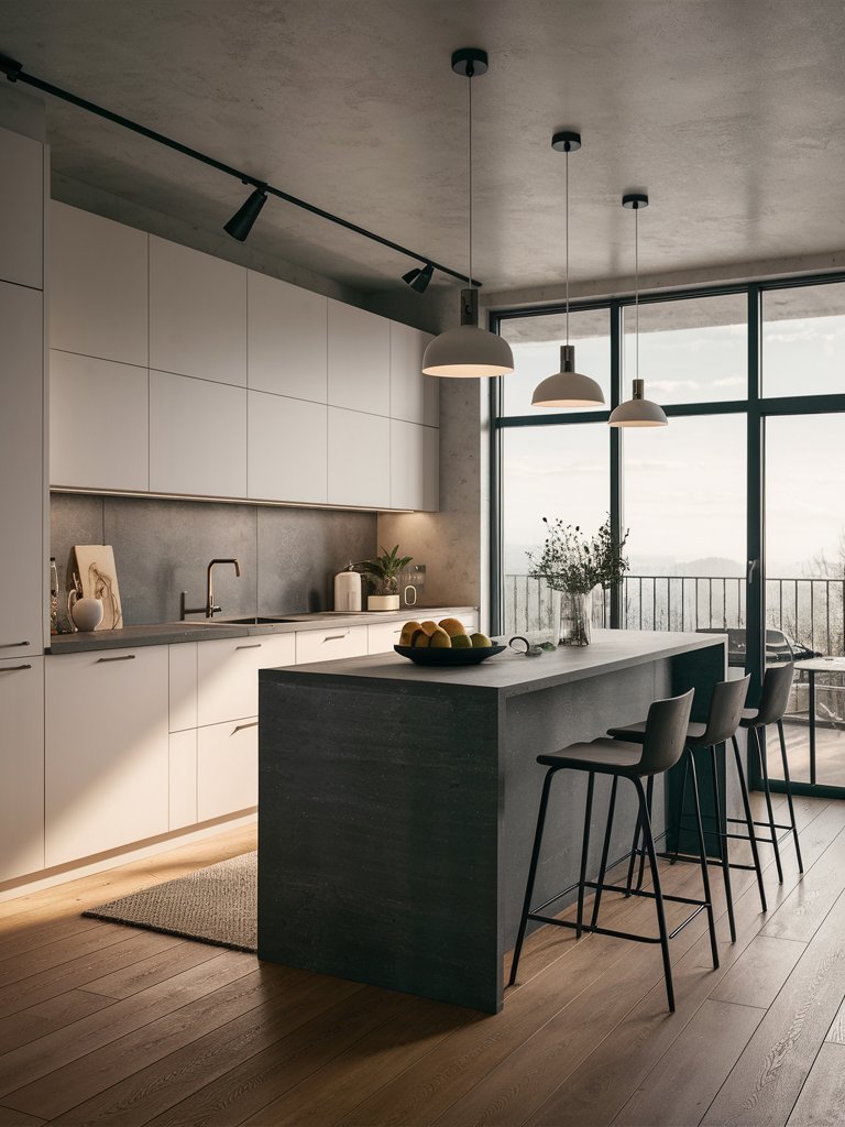 Additionally, the dark stone surface complements the kitchen’s neutral palette, creating a perfect balance between warmth and modernity. This bold contrast enhances the kitchen’s visual appeal without compromising its minimalist essence.