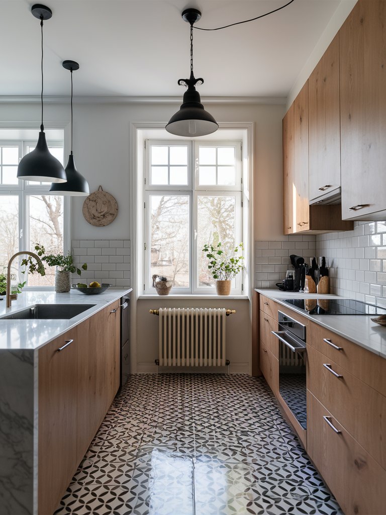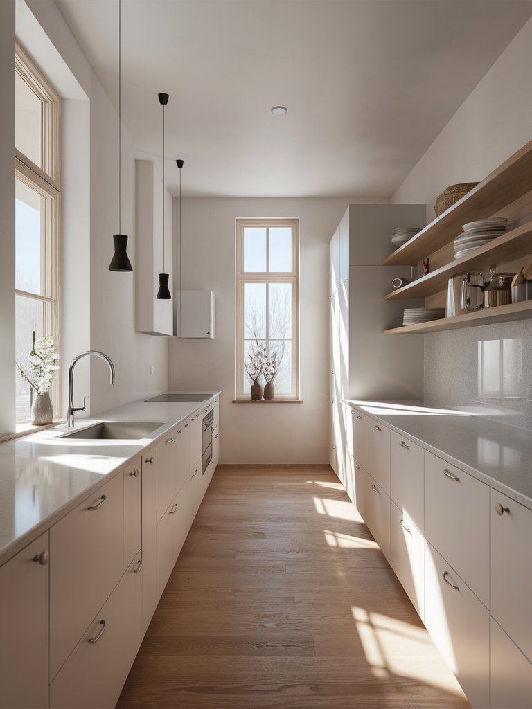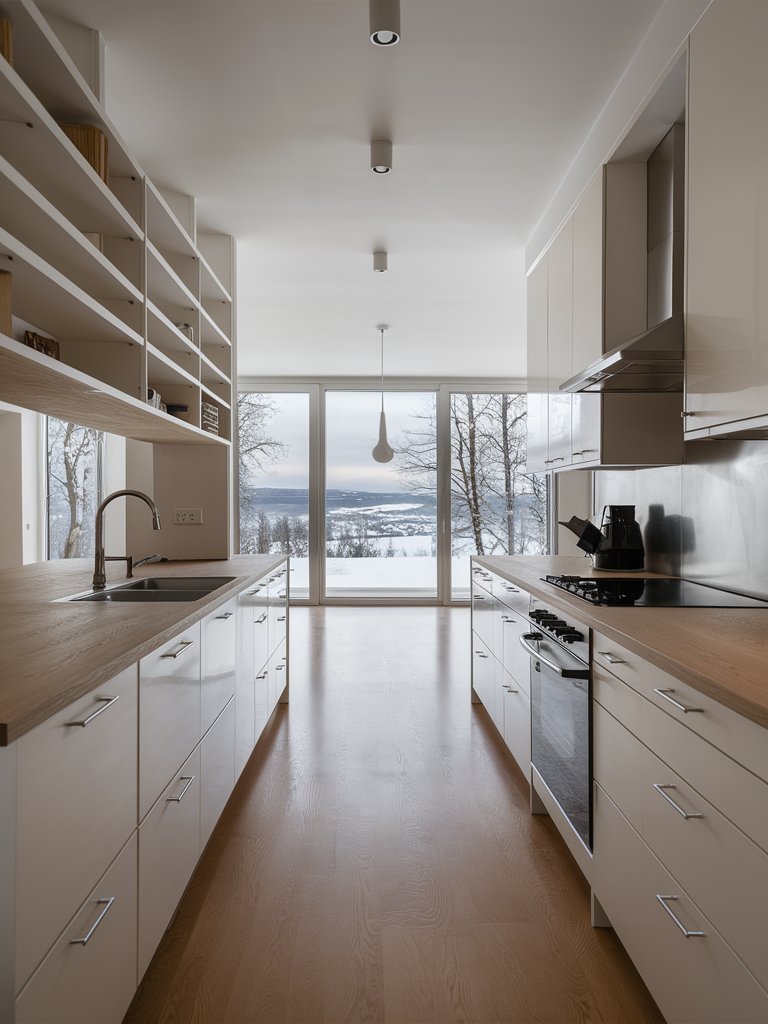 This kitchen follows a galley layout, which maximizes efficiency by creating a streamlined workflow. The parallel countertops ensure easy access to both work surfaces, while the long central aisle allows for smooth movement. The layout provides generous counter space for meal preparation and accommodates multiple users without feeling cramped. This efficient use of space aligns with Scandinavian design’s emphasis on practicality and simplicity. The symmetrical arrangement also enhances visual balance, making the kitchen feel orderly and well-structured.