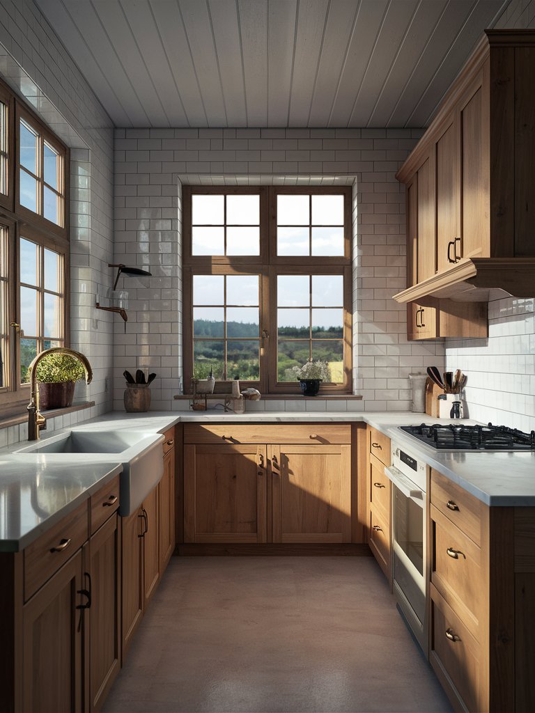 Additionally, the wood cabinetry contrasts beautifully with the crisp white countertops and subway tile backsplash, creating a balanced composition that feels both cozy and fresh.