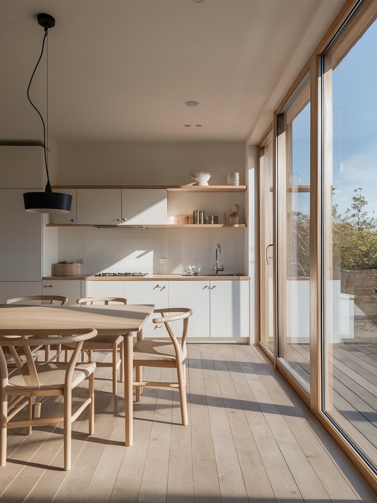 A standout feature of this kitchen is the large wooden-framed windows that flood the space with natural light. Scandinavian design prioritizes natural illumination, and these expansive windows make the room feel open and airy. The use of warm wood frames adds a cozy, organic feel while contrasting beautifully against the white cabinetry. The windows also create a strong indoor-outdoor connection, allowing nature to become an integral part of the design. Natural light enhances the beauty of the materials and ensures that the kitchen remains welcoming throughout the day.