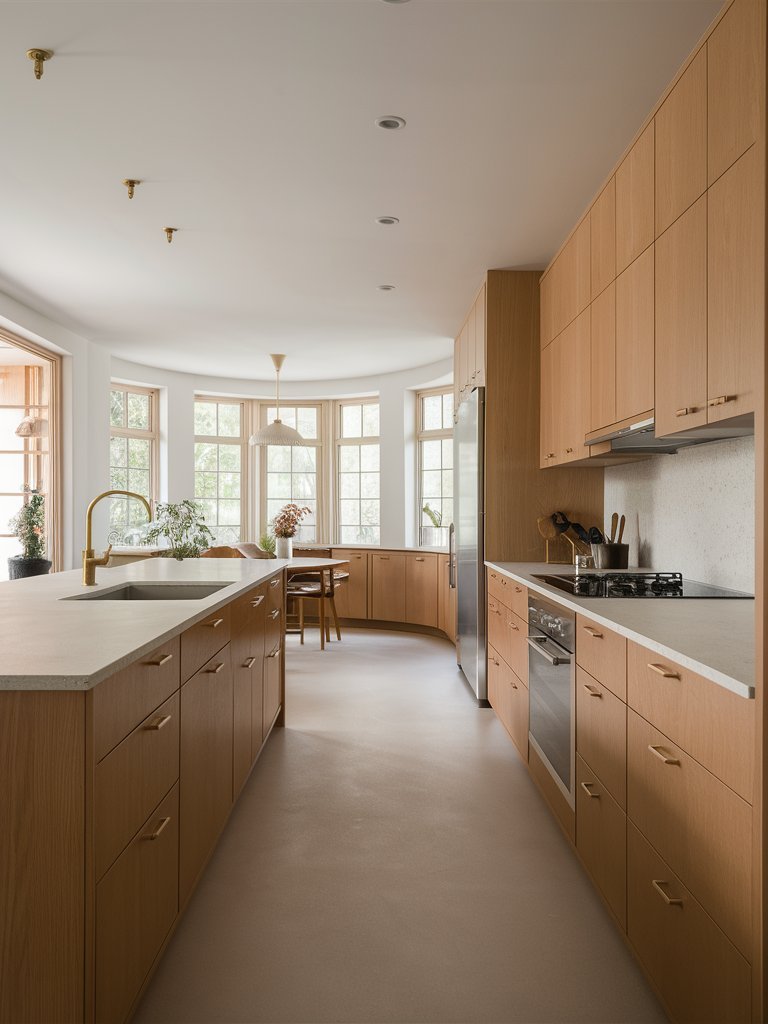 The handle design in this kitchen is particularly noteworthy. Rather than using large, protruding handles, the cabinetry features delicate curved pulls that blend into the design. This enhances the minimalist aesthetic, avoiding any unnecessary visual clutter. The uniform cabinetry ensures continuity, making the kitchen feel uninterrupted and cohesive. The soft-close mechanisms likely used in this type of cabinetry reinforce the Scandinavian principle of quiet luxury—where function meets understated elegance. This design choice ensures the kitchen remains both ergonomic and visually pleasing.