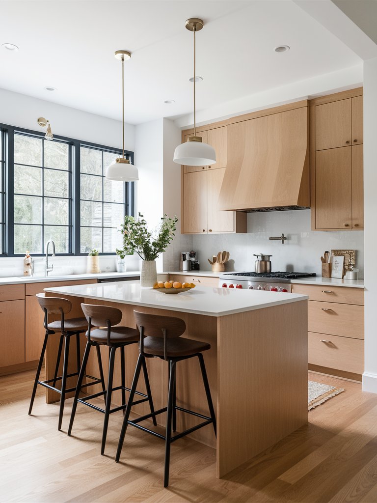 The kitchen island serves as a multifunctional space, providing additional prep space, casual dining, and an area for socializing. The seating arrangement includes dark wood and black metal barstools, which create a striking contrast against the light wood island. The curved backs of the stools add ergonomic comfort while maintaining a sleek, modern profile. The island’s seamless integration into the overall design makes it a natural focal point, ensuring that the kitchen remains both stylish and practical.