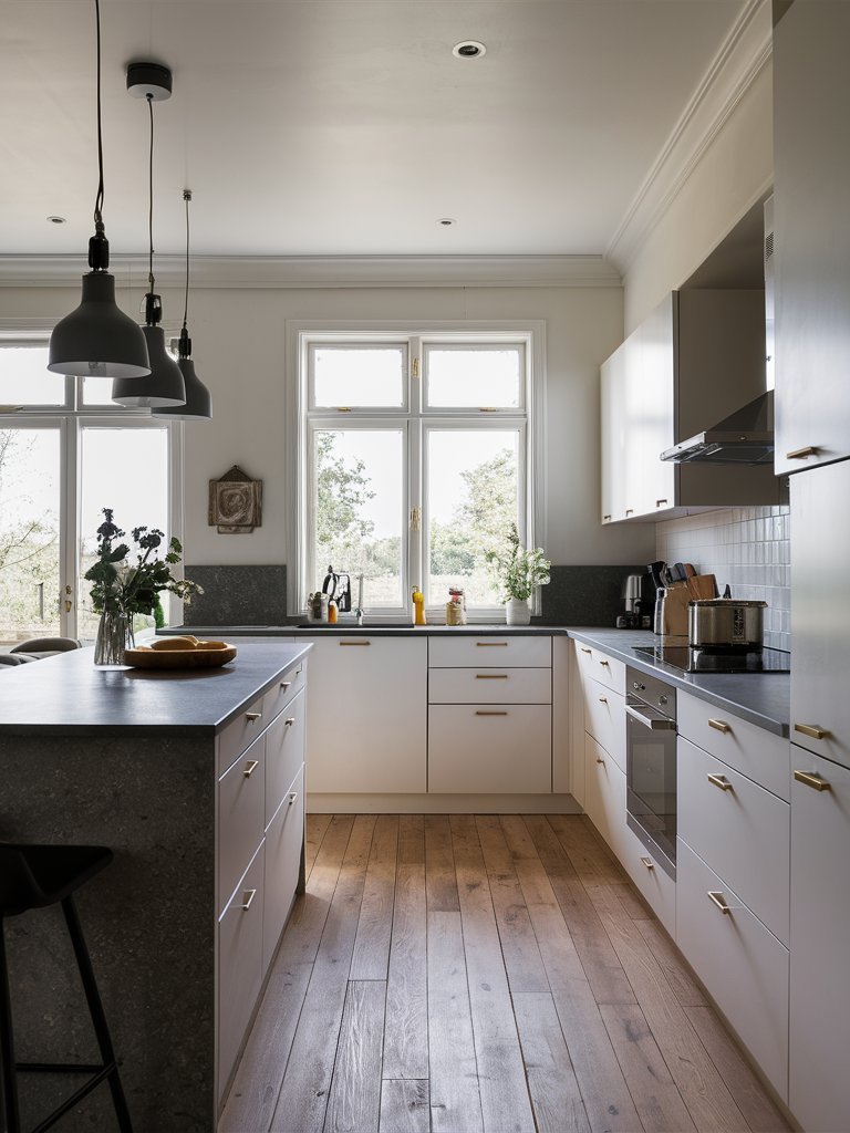 This Scandinavian kitchen masterfully balances light and dark tones to create a sophisticated yet welcoming space. The combination of white cabinetry with deep charcoal countertops and backsplash establishes a striking contrast that feels both modern and timeless. The dark elements ground the space, preventing it from feeling too sterile, while the light cabinetry ensures an airy and open feel. This blend of light and dark aligns with Scandinavian design principles, which favor simplicity but embrace contrast for depth and warmth.
