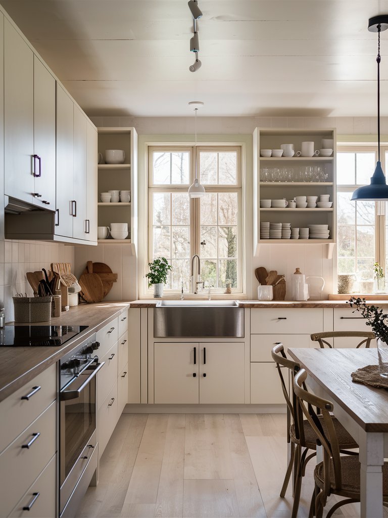 Instead of upper cabinets dominating the space, this kitchen features open shelving that adds character and practicality. The shelves are neatly styled with white dishware and glassware, creating a curated yet functional display. This approach reinforces the Scandinavian design philosophy of openness and accessibility. By eliminating heavy cabinetry, the space feels lighter and more inviting. The symmetrical arrangement around the central window enhances visual balance, making the shelving a seamless part of the kitchen’s overall composition.
