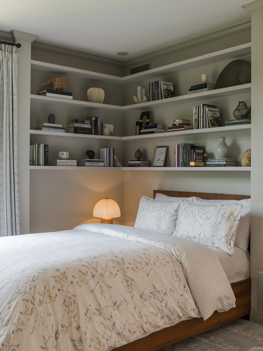 Corner shelves are a clever way to use often-neglected spaces. They provide storage or display areas without taking up valuable floor space. Perfect for books, plants, or decorative items, corner shelves help maintain an organized, tidy bedroom. They are versatile in design and size, fitting both small and large rooms. By utilizing corners creatively, you can maximize storage, add visual interest, and keep your bedroom functional and stylish, turning every inch of space into a design opportunity.