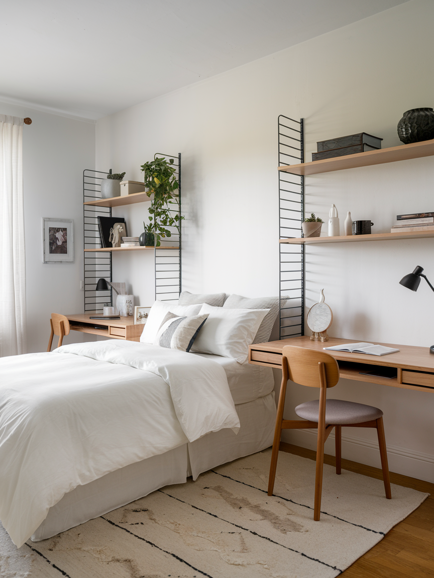 Floating desks are perfect for bedrooms that double as workspaces. They save floor space and create a sleek, modern look while providing a functional area for work or hobbies. Pair with a stylish chair and some shelves above for storage and display. Floating desks are versatile and ideal for small bedrooms, keeping the space open and airy. They prove that bedrooms can serve multiple purposes without sacrificing style or comfort, making them practical and aesthetically pleasing at the same time.