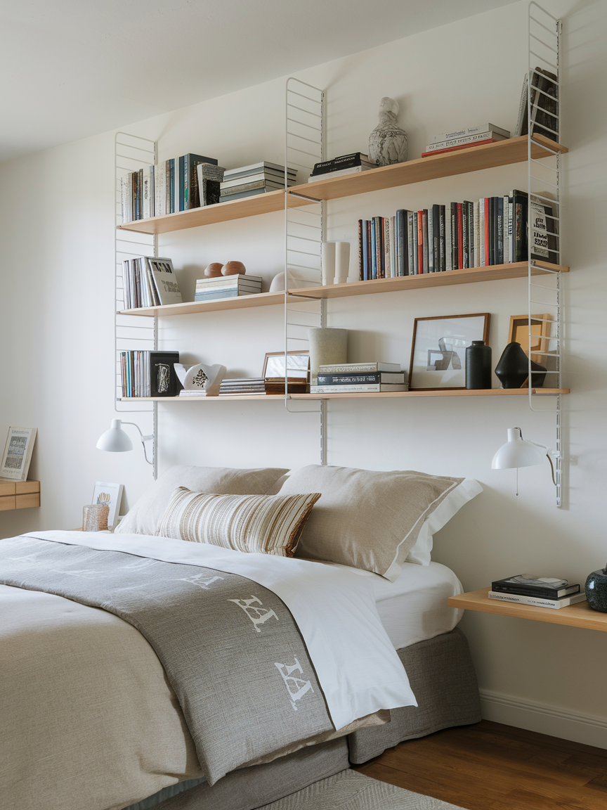 Floating shelves are a stylish way to add storage without crowding the floor. Perfect for displaying books, decorative pieces, or small plants, they help make your bedroom feel airy and open. They work well in small bedrooms where floor space is precious. Floating shelves also allow you to play with height, texture, and color, adding dimension to your walls. They can be mixed and matched or arranged symmetrically for a chic, curated look. A few well-placed floating shelves make the room functional and stylish simultaneously.