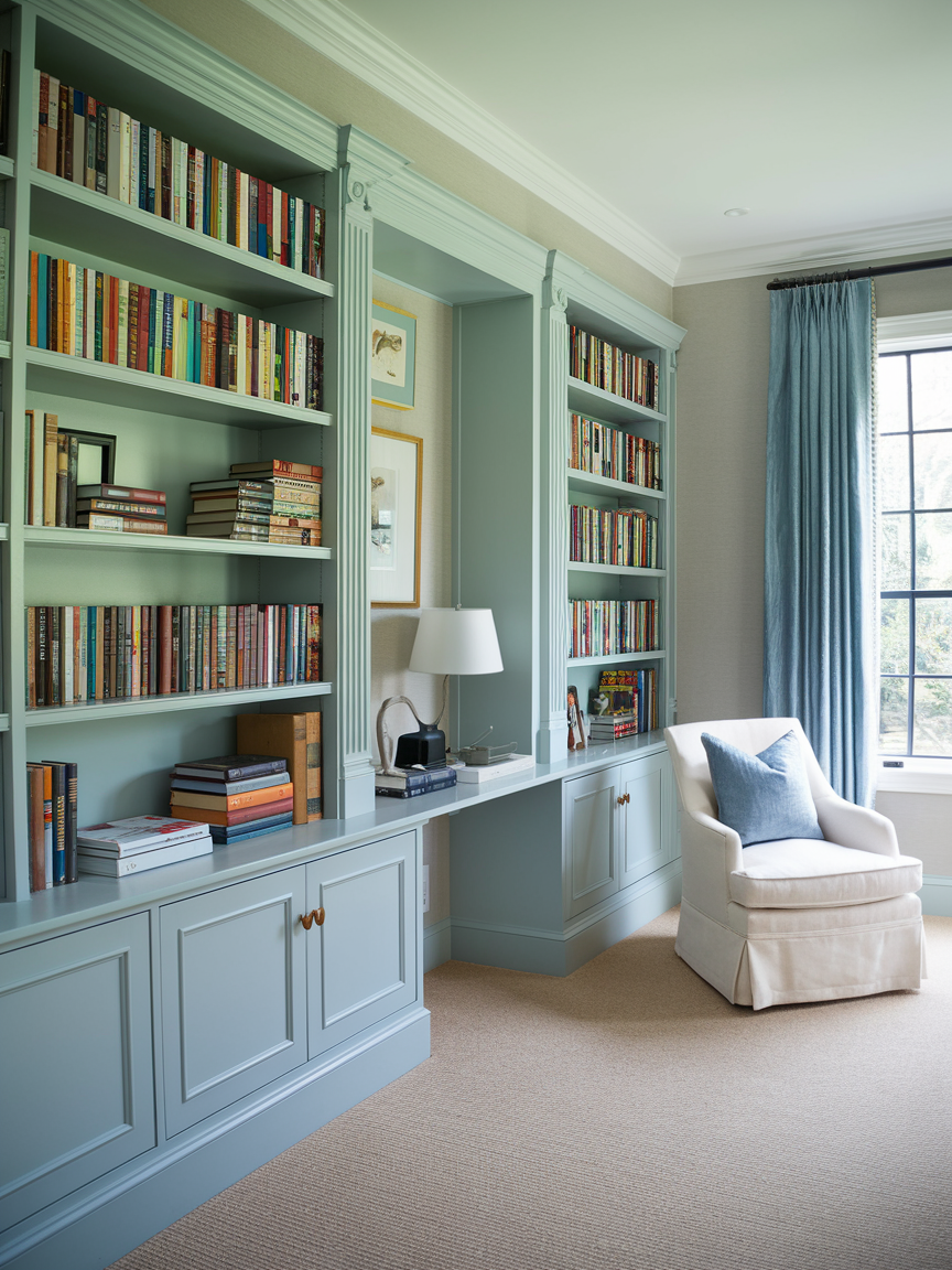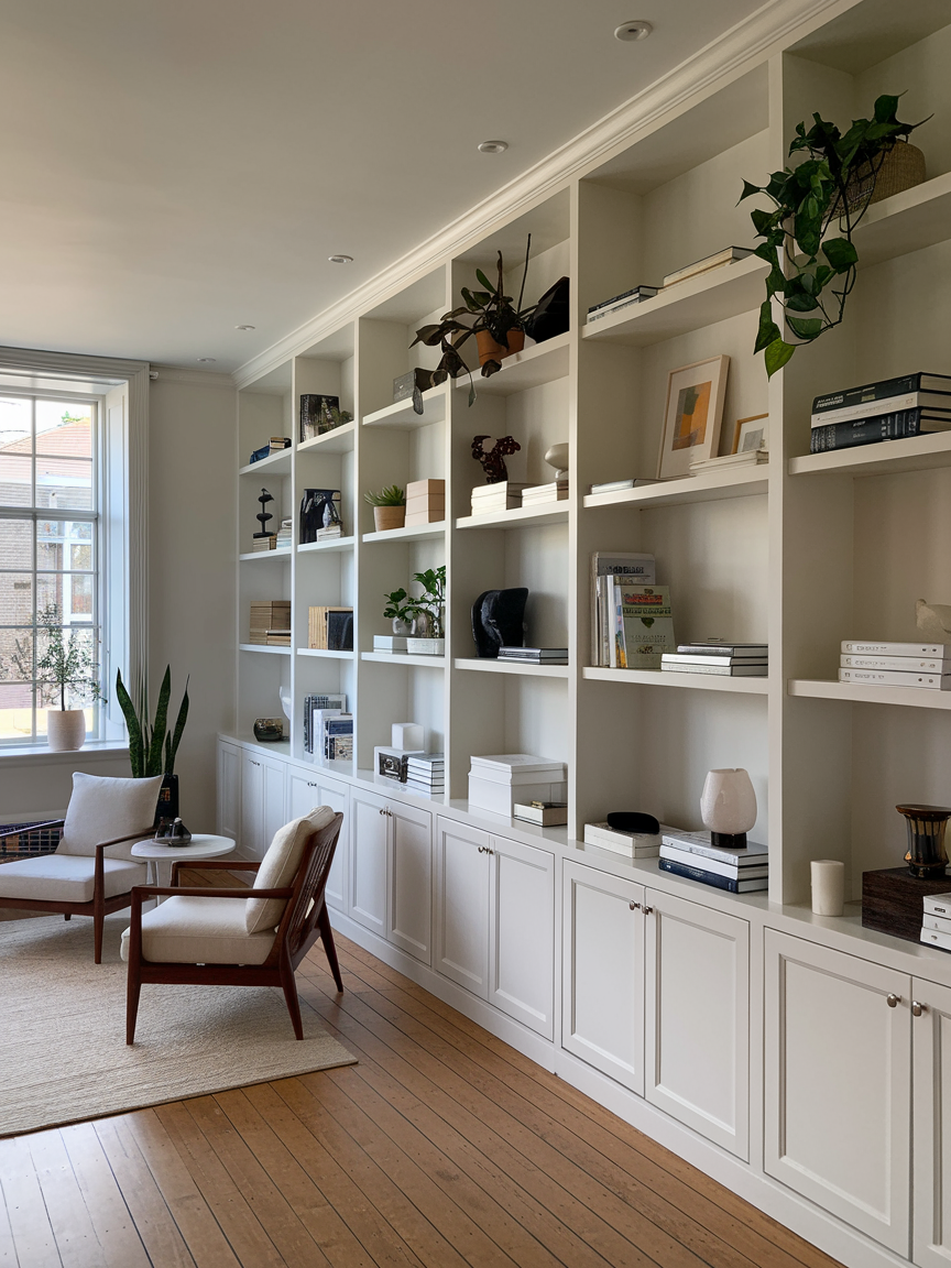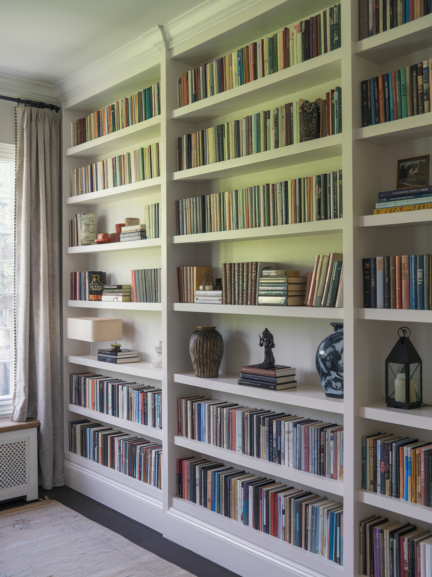 White built-in bookshelves offer a clean, fresh aesthetic that keeps your space feeling open and uncluttered. The simplicity of this design allows your books and decor to take center stage without overwhelming the room. White surfaces reflect natural light, making the space feel brighter and more expansive. When styled with restraint and intentional spacing, these shelves create a calm, serene environment that blends minimalism with warmth.