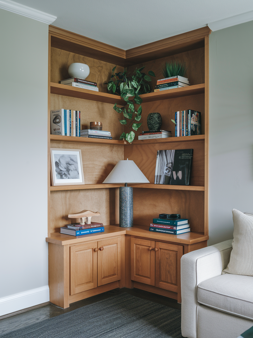 Corner built-in bookshelves make excellent use of often-overlooked spaces, turning them into functional and stylish features that enhance the overall flow of the room. By wrapping shelving around corners, you create a seamless and cohesive design that maximizes storage without adding bulk. These shelves are perfect for displaying books, small decor pieces, or plants while maintaining a clean and organized look. The curved or angled layout also adds a subtle architectural element, making the space feel more dynamic and thoughtfully designed.