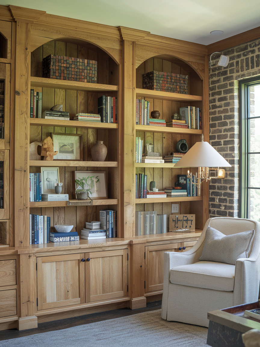 Natural wood finishes bring warmth, texture, and an organic feel to built-in bookshelves, making the space feel more grounded and inviting. The unique grain patterns and tones of the wood add depth and character, preventing the design from feeling too flat or sterile. This approach works beautifully in both modern and rustic interiors, creating a harmonious balance between clean lines and natural elements. The warmth of the wood enhances the cozy atmosphere, making your reading space feel more welcoming and comfortable.