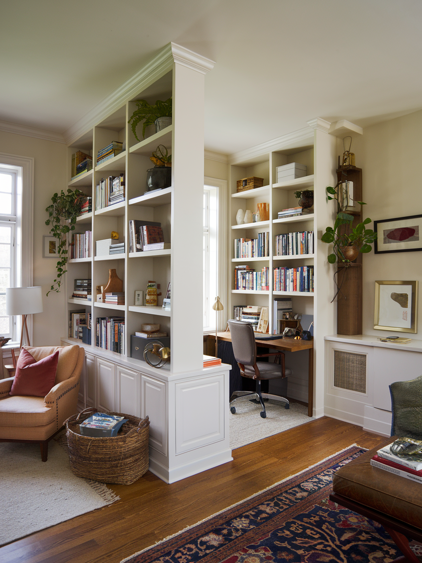 Using built-in bookshelves as room dividers is a smart way to define spaces while maintaining an open and airy feel. Open shelving allows light to pass through, preventing the area from feeling closed off or cramped. This design is especially useful in open-plan homes, where it helps create distinct zones for reading, working, or relaxing. At the same time, it provides additional storage and display space, making it both functional and visually appealing.