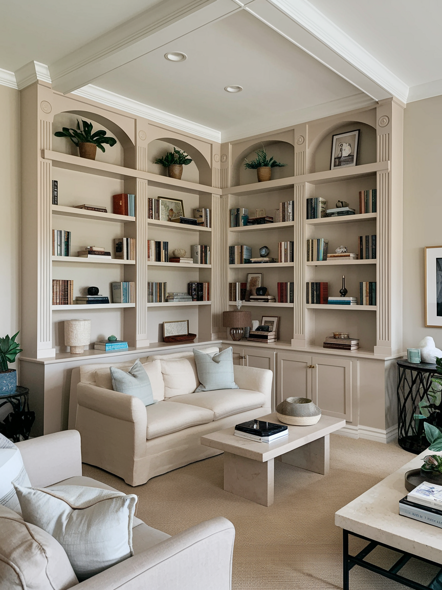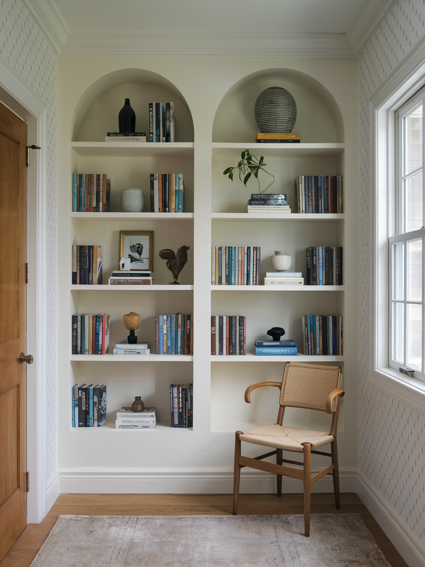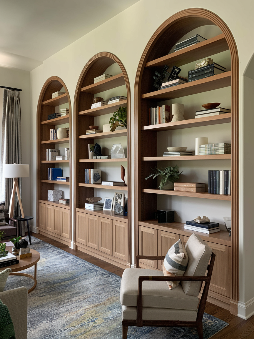 Arched built-in bookshelves introduce a soft, architectural elegance that instantly elevates the design of your space. The curved lines create a sense of movement and contrast beautifully with straight walls and furniture. This unique feature adds a custom, high-end feel while maintaining functionality. Whether painted in a neutral tone or highlighted with subtle lighting, arched shelves become a focal point that feels both timeless and sophisticated, enhancing the overall aesthetic of your home.