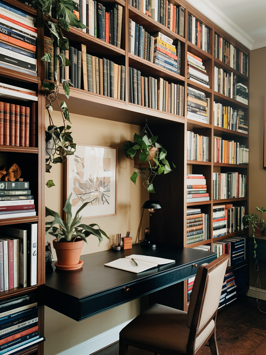 A built-in desk seamlessly integrated into your bookshelf design creates a highly functional yet visually cohesive workspace that feels both inspiring and organized. Surrounding your desk with books fosters a sense of intellectual focus, encouraging productivity and creativity throughout the day. This setup keeps everything within arm’s reach, reducing clutter while maintaining a clean and streamlined appearance. Adding subtle lighting, comfortable seating, and a few curated decor pieces enhances the atmosphere, making the space feel warm and inviting rather than purely utilitarian. It’s an ideal solution for those who want a work area that blends effortlessly into a cozy, book-filled environment.