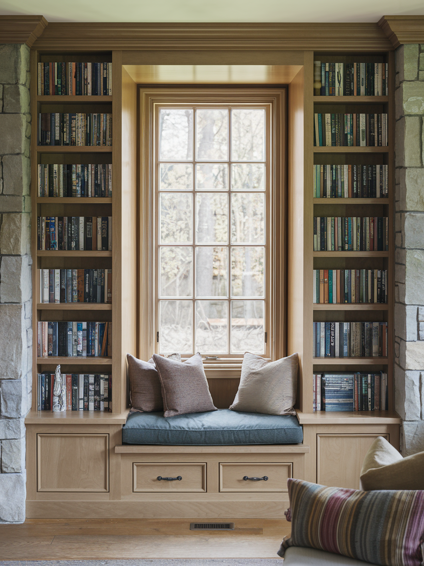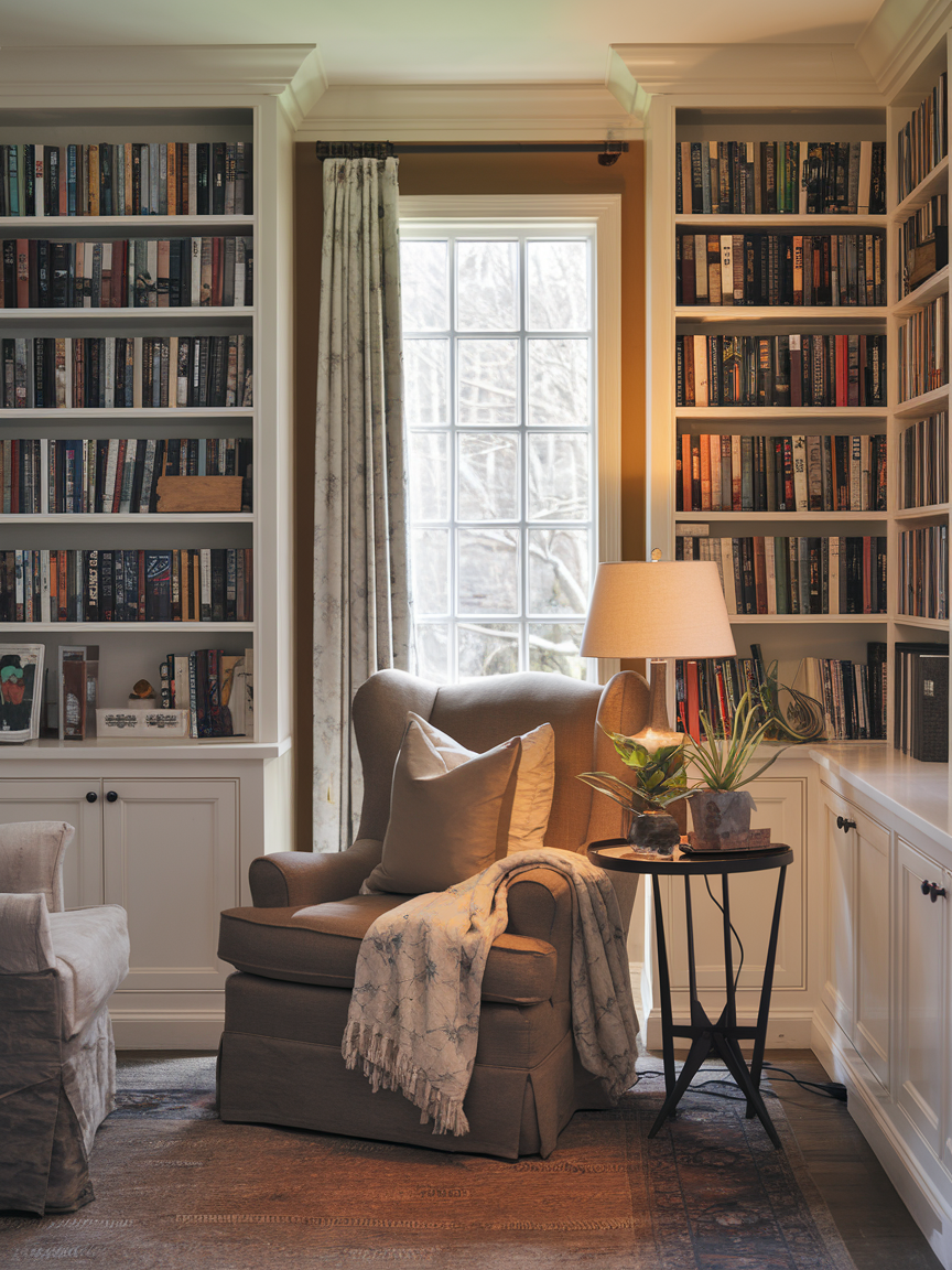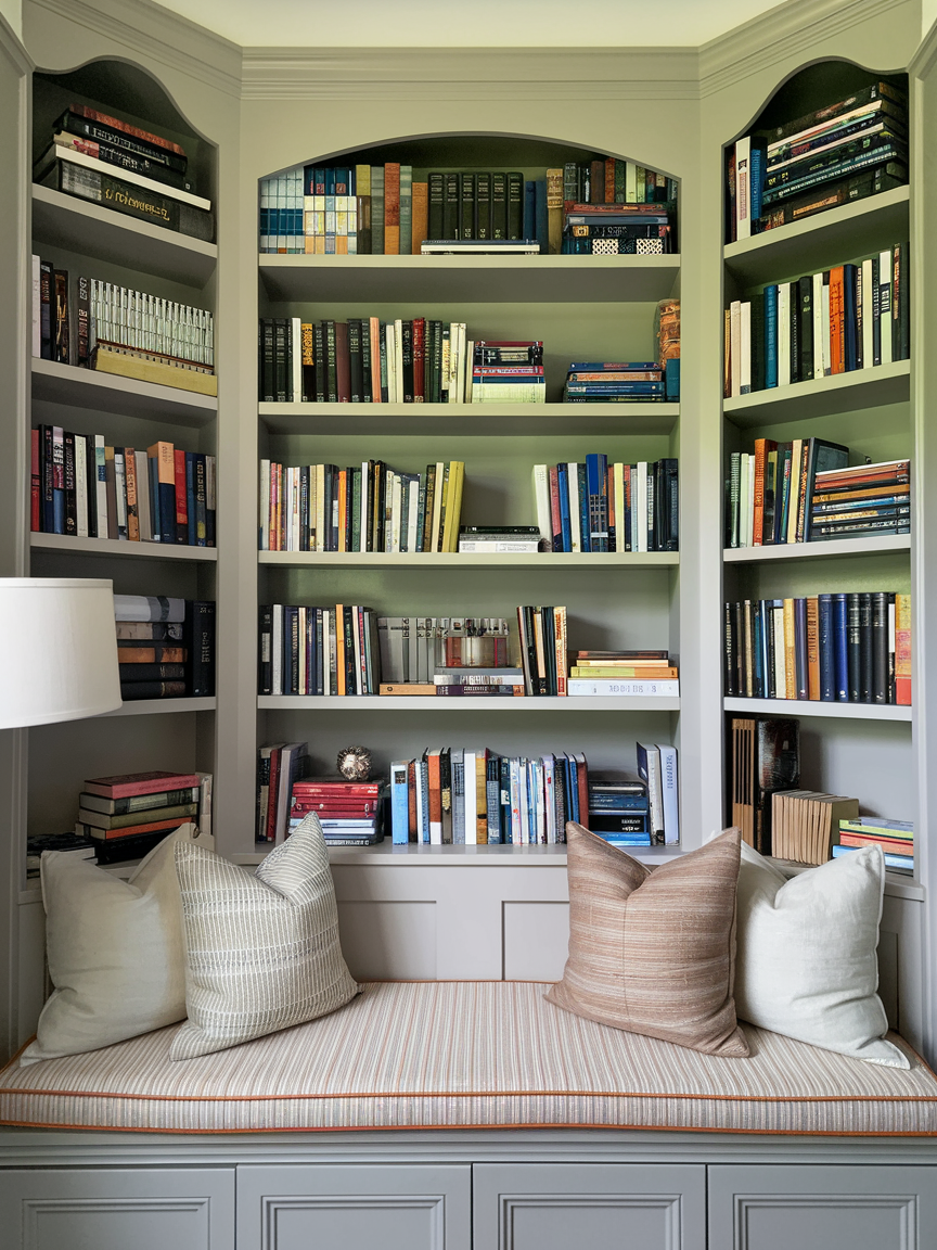 A built-in reading nook surrounded by bookshelves offers a dedicated retreat for relaxation and quiet reflection. The enclosed feel created by shelving on multiple sides adds a sense of intimacy, making it easier to disconnect from distractions and fully enjoy your reading time. Layering the nook with plush cushions, soft throws, and warm lighting enhances comfort while reinforcing the cozy atmosphere. This design transforms even a small corner into a meaningful and functional space that feels both comforting and inspiring.