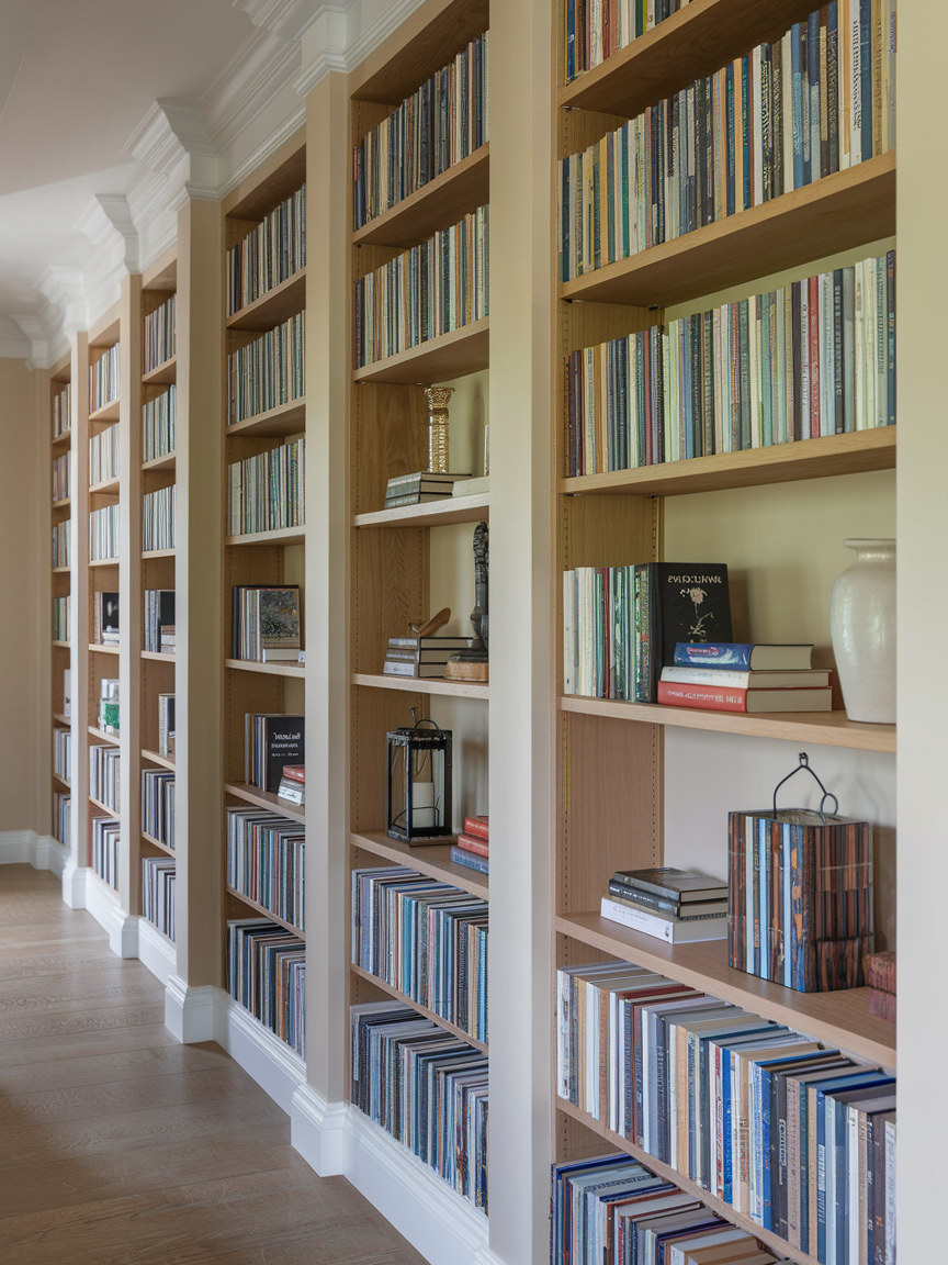 Hallways are often underutilized, but incorporating built-in bookshelves can transform these transitional spaces into functional and visually engaging areas. Lining a hallway with shelves creates a mini library effect, turning a simple passage into a meaningful design feature. This approach adds storage without taking up additional room, making it ideal for smaller homes. When styled with a mix of books and subtle decor, hallway shelves create a welcoming and cohesive flow throughout your home, enhancing both practicality and aesthetic appeal.