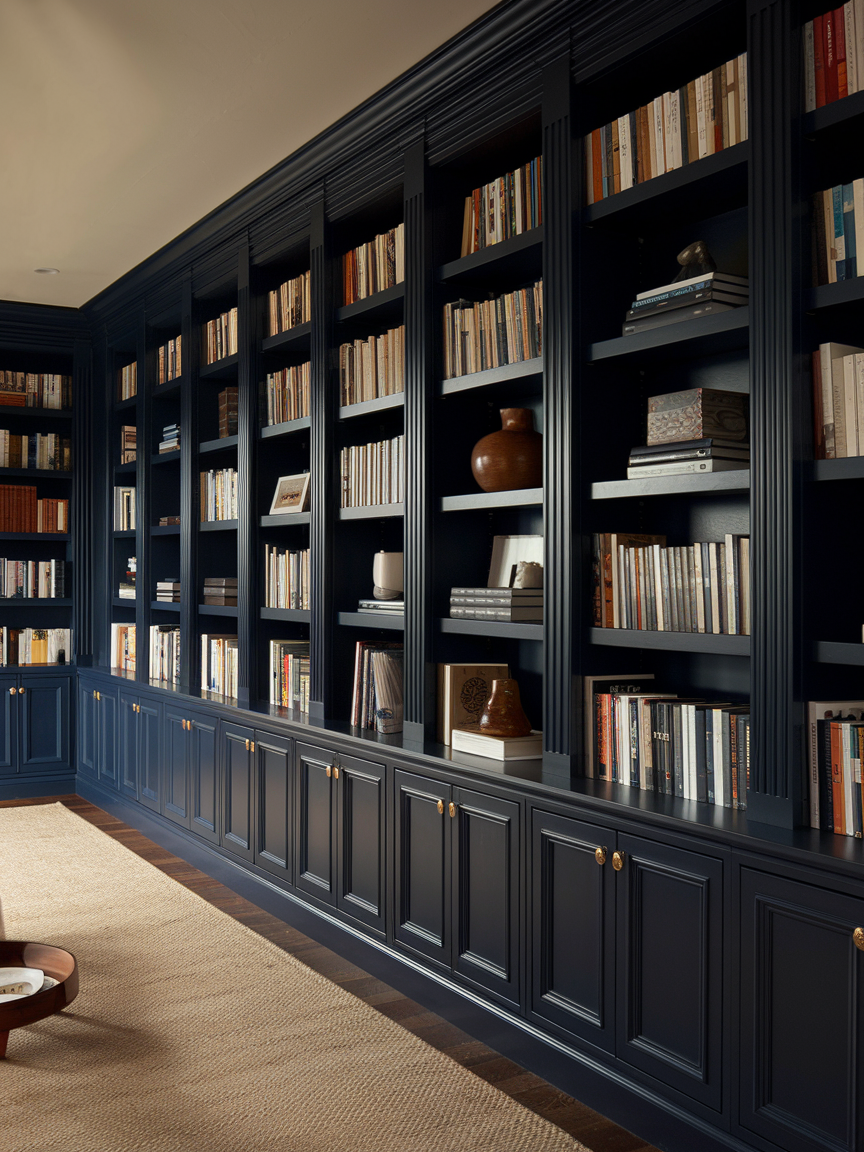 Dark-toned built-in bookshelves introduce depth, richness, and a sense of intimacy to your space. Shades like deep navy, charcoal, or espresso create a moody backdrop that enhances the visual impact of your books and decor. These tones absorb light, making the room feel more grounded and cozy, especially when paired with warm lighting and lighter accents. This approach is perfect for creating a sophisticated, library-inspired environment that feels both luxurious and inviting.