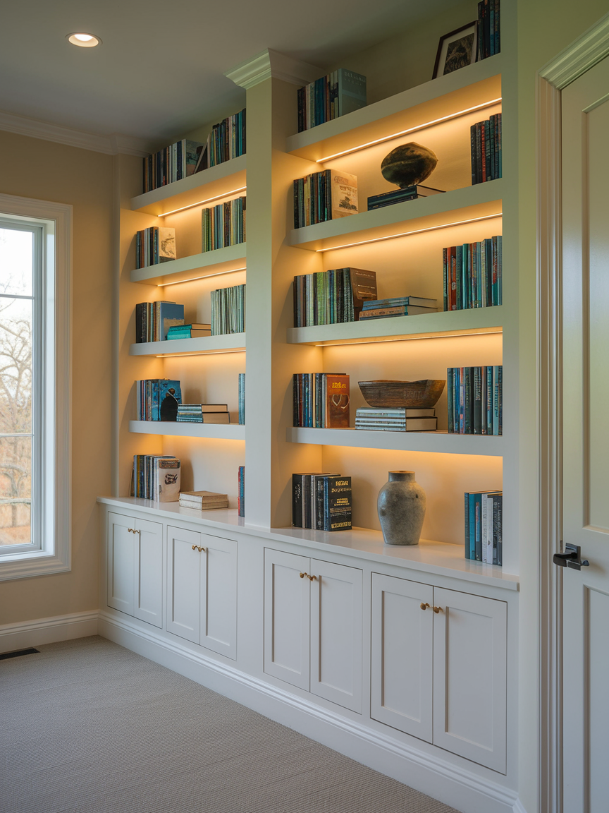 Adding warm lighting to built-in bookshelves enhances their functionality while creating a cozy and inviting ambiance. Integrated LED strips or spotlights highlight books and decorative objects, adding depth and dimension to the shelving. The soft glow creates a relaxing atmosphere, especially in the evening, making the space feel more intimate and comfortable. This subtle feature elevates the overall design, transforming simple shelves into a warm and welcoming focal point.