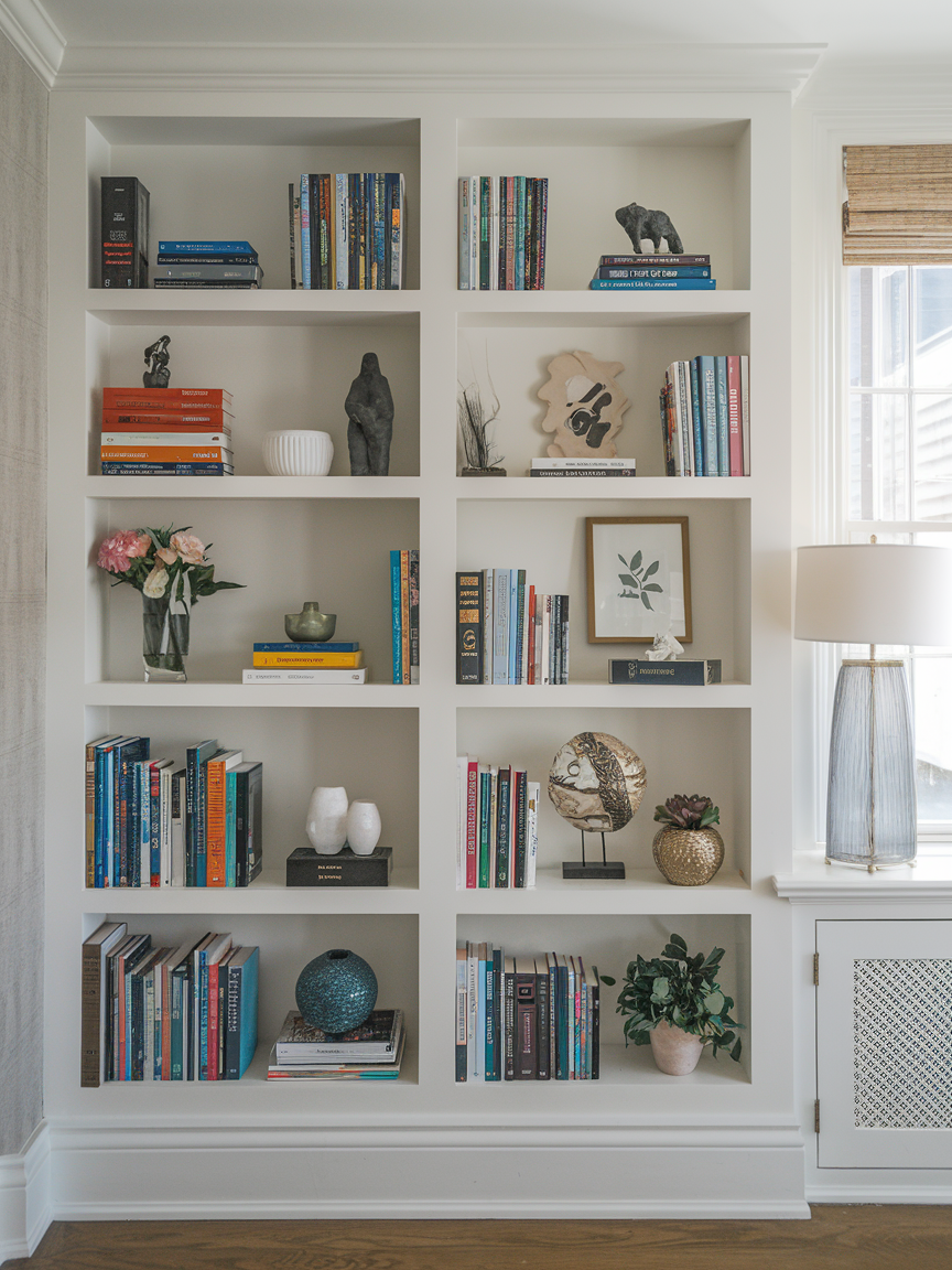 Incorporating decorative objects alongside books creates a layered and curated display that reflects your personality and style. Mixing items such as vases, sculptures, framed art, or plants adds depth and visual interest, preventing the shelves from feeling too uniform. The key is to balance these elements with books, ensuring the arrangement feels intentional rather than cluttered. This approach transforms your bookshelf into a storytelling feature, making the space feel more personal, creative, and engaging.