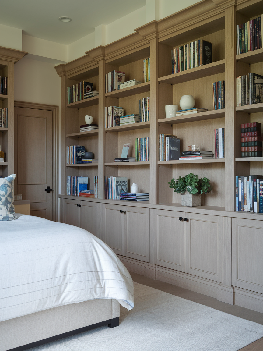 Integrating built-in bookshelves into the bedroom creates a personal sanctuary that combines rest with inspiration. Shelves placed near the bed allow easy access to books while eliminating the need for additional furniture, keeping the space open and uncluttered. This design encourages relaxation and quiet moments, making the bedroom feel more thoughtful and intentional. With soft lighting and minimal styling, the shelves contribute to a calm, cozy environment perfect for unwinding.