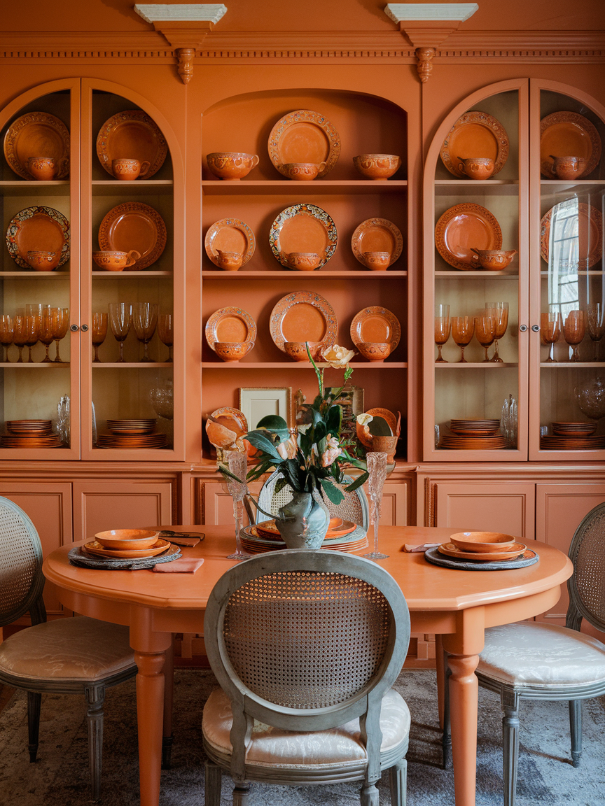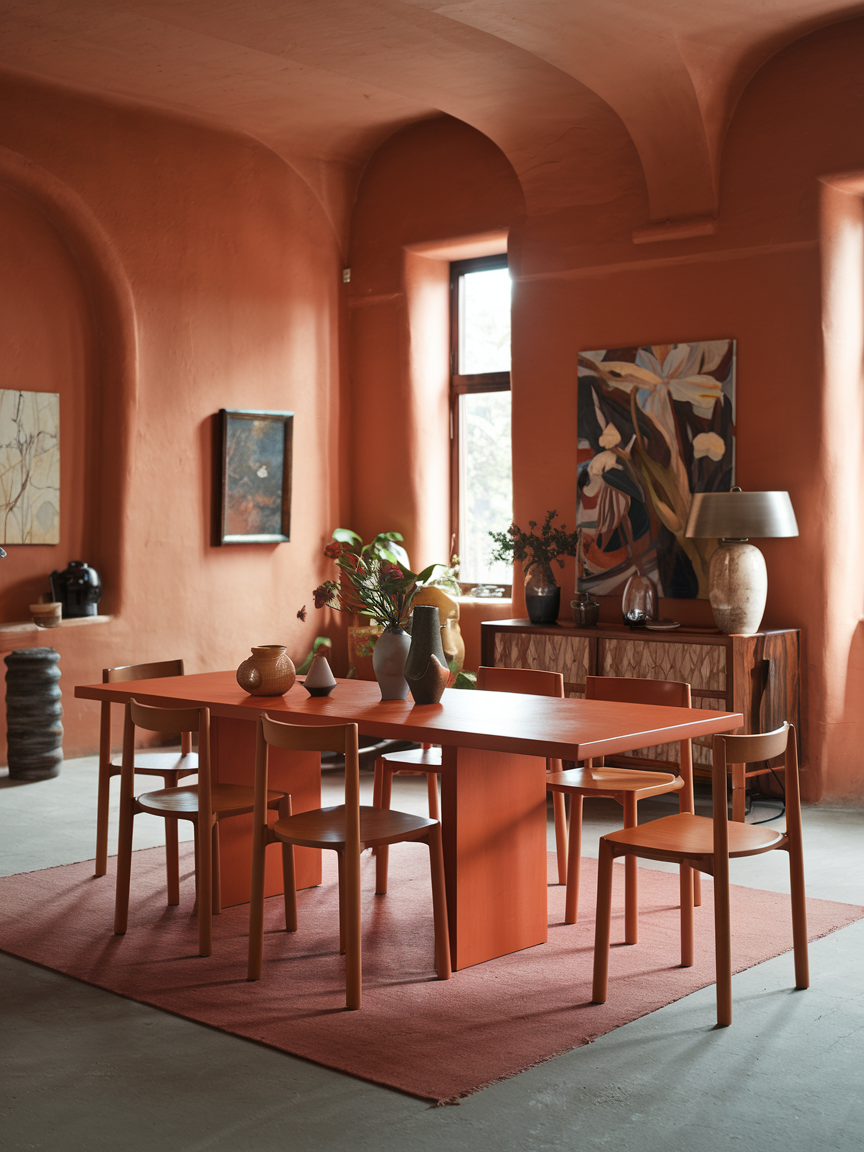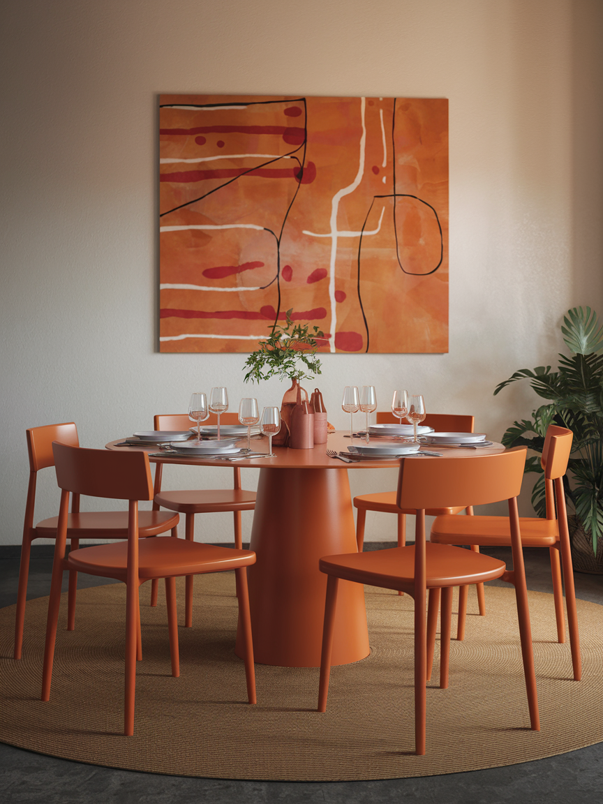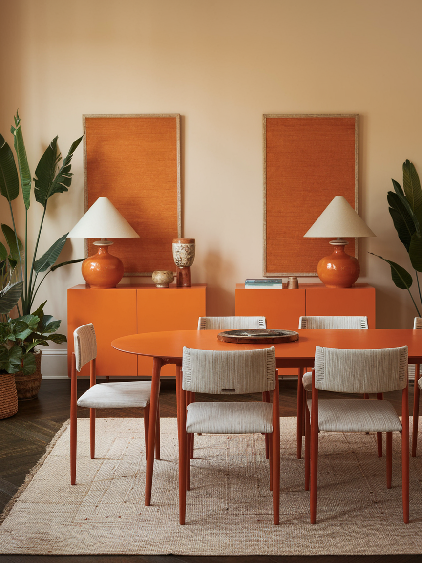 Layering different shades of orange, such as peach, terracotta, rust, and burnt orange, creates a rich and dynamic visual effect. This approach prevents the space from feeling flat while maintaining a cohesive palette. Incorporating these tones through various materials like textiles, ceramics, and artwork adds depth and interest. Neutral elements help break up the color, ensuring the room feels balanced rather than overwhelming. This technique is especially effective for creating a warm, inviting dining room with a curated, designer feel.
