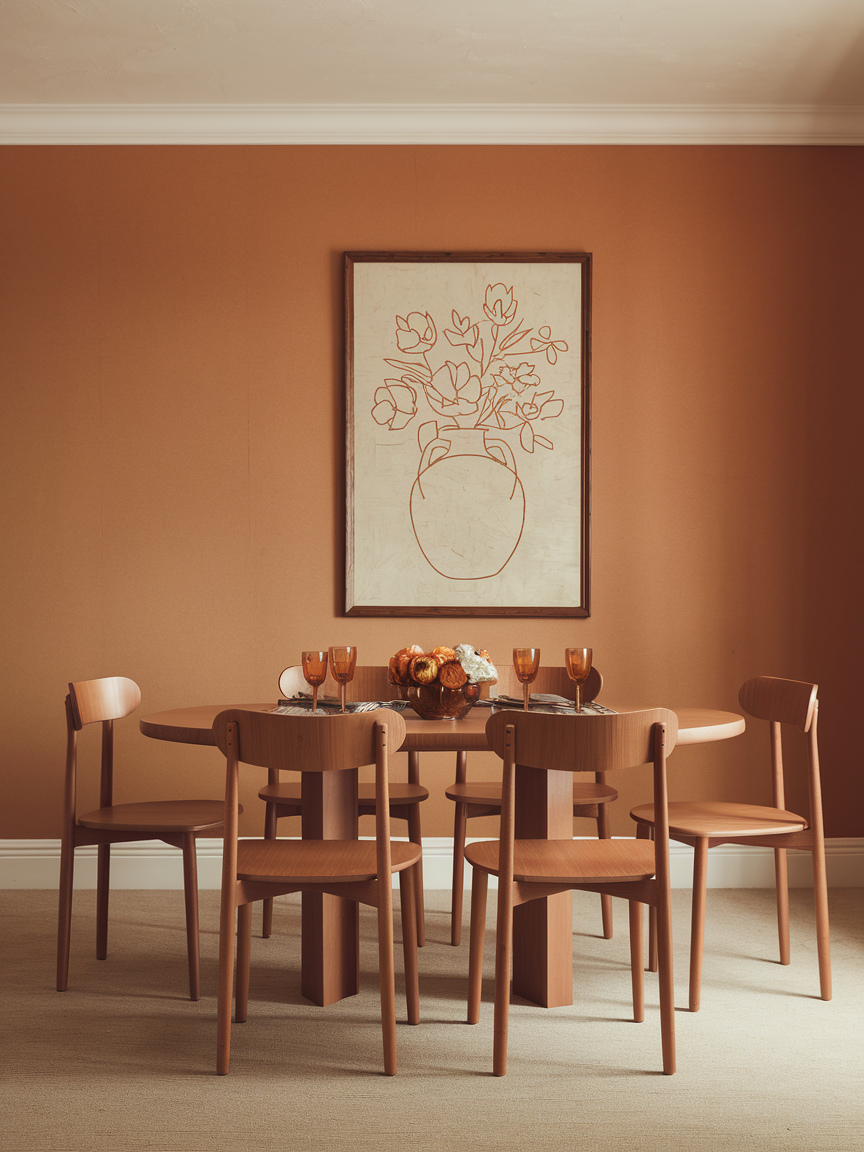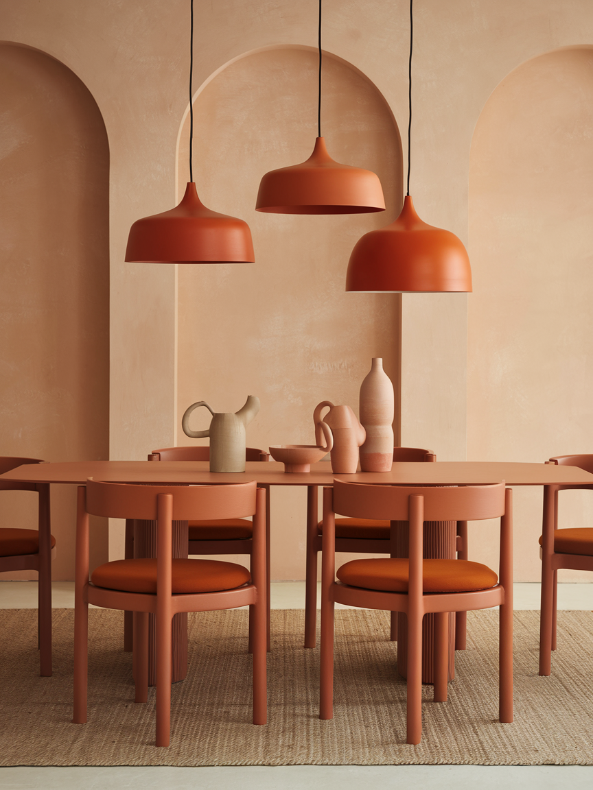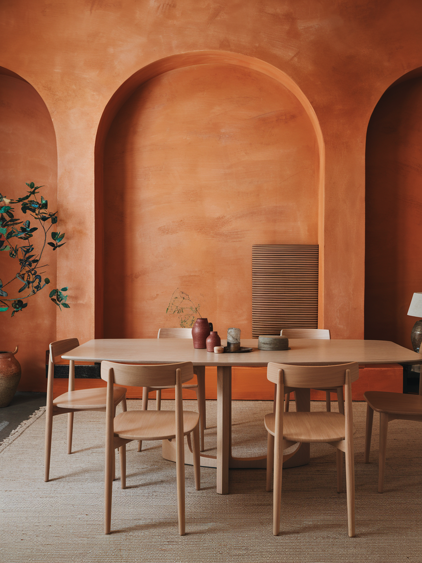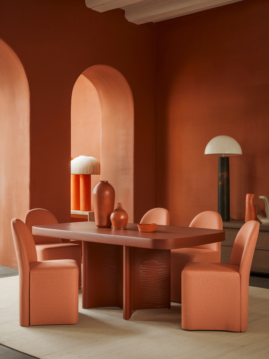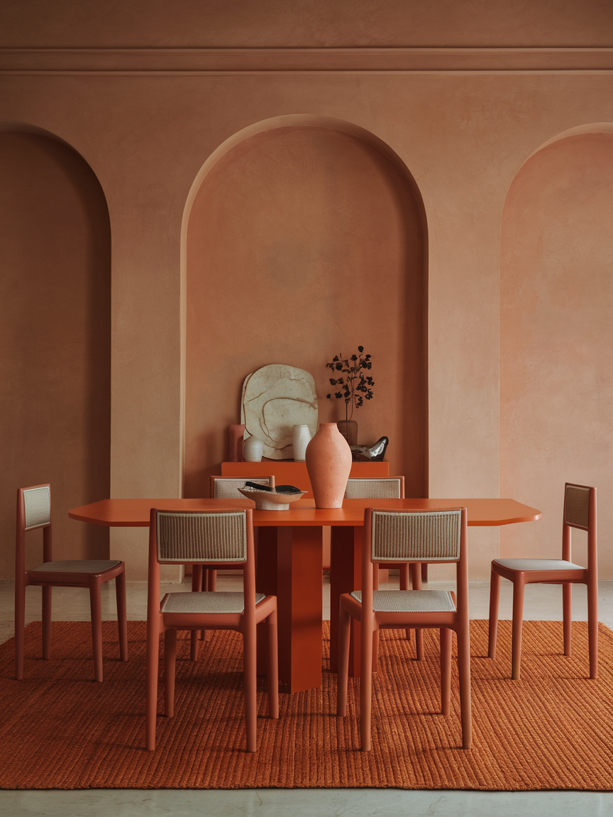Layering different shades of orange, such as peach, terracotta, rust, and burnt orange, creates a rich and dynamic visual effect. This approach prevents the space from feeling flat while maintaining a cohesive palette. Incorporating these tones through various materials like textiles, ceramics, and artwork adds depth and interest. Neutral elements help break up the color, ensuring the room feels balanced rather than overwhelming. This technique is especially effective for creating a warm, inviting dining room with a curated, designer feel.
