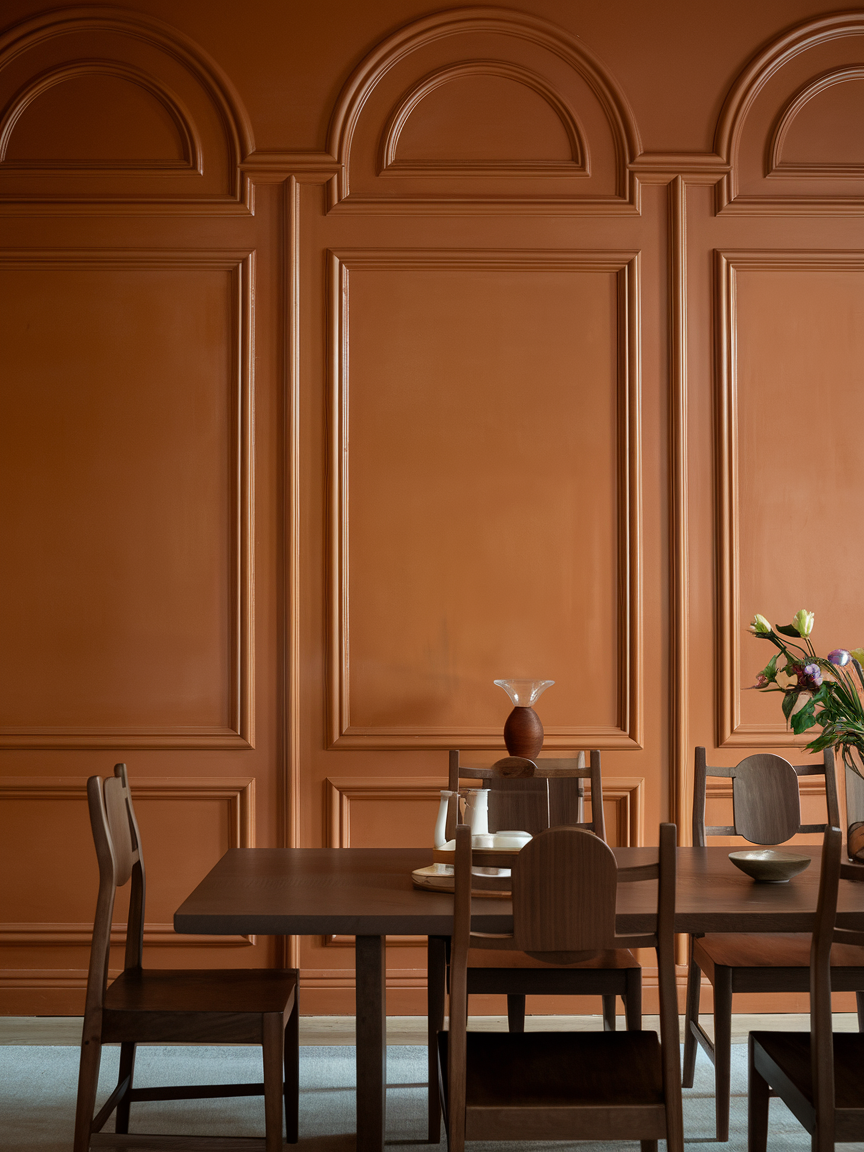 Wall paneling painted in muted orange tones introduces both color and architectural interest to your dining room. The added texture creates depth, making the space feel more layered and thoughtfully designed. Softer shades ensure the look remains elegant rather than overpowering, especially when paired with neutral furniture and minimal decor. Paneling works across various styles, from classic to contemporary, offering timeless appeal. Combined with warm lighting, it creates a cozy backdrop that enhances the dining experience while maintaining a polished aesthetic.