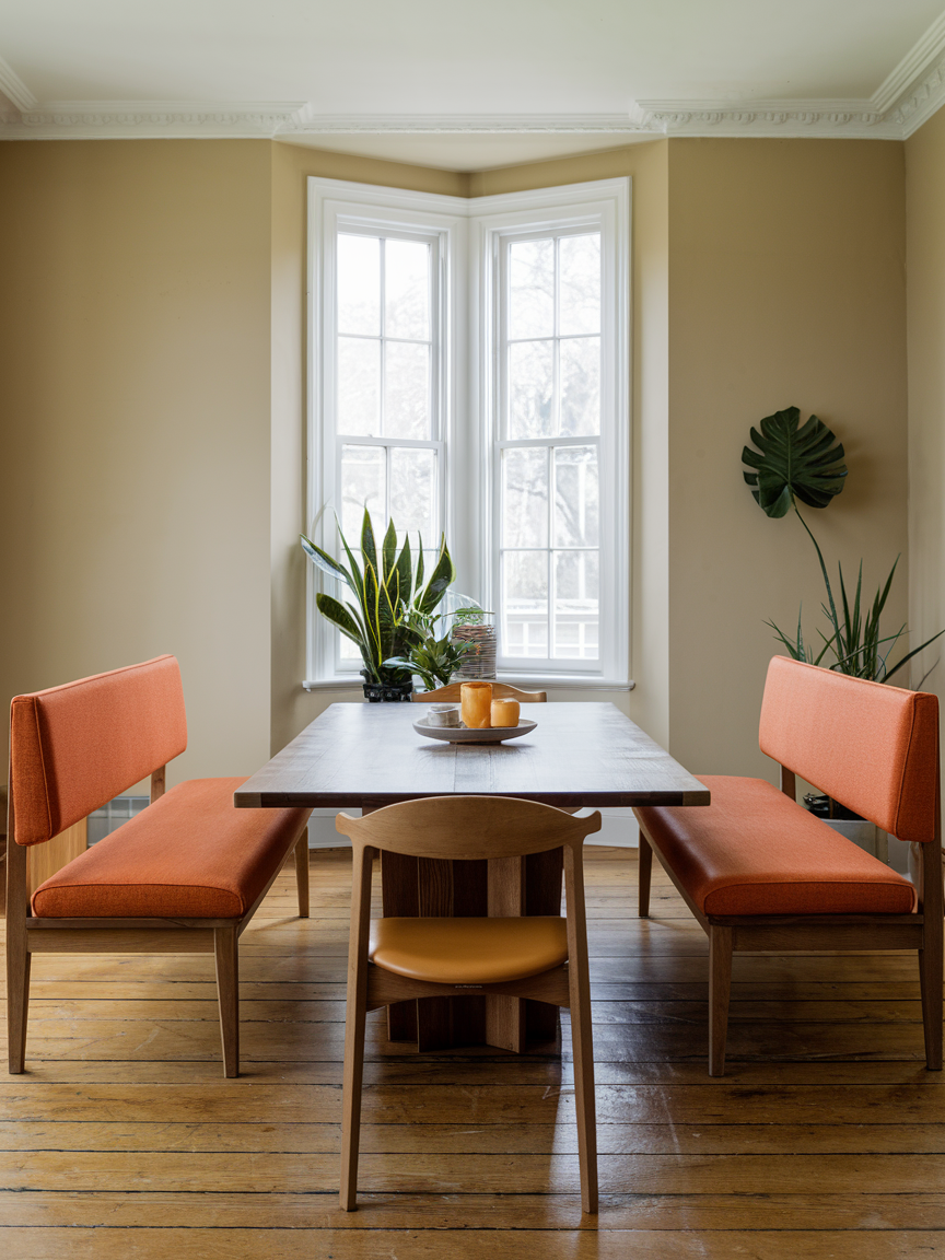 An upholstered bench in an orange tone adds a relaxed and welcoming element to your dining room. It softens the overall look while introducing color in a comfortable and approachable way. Benches encourage a more casual seating arrangement, perfect for family meals or gatherings. Choosing high-quality fabrics with subtle textures enhances the design while ensuring durability. Paired with neutral chairs or a wooden table, the bench creates a balanced composition that feels cozy, functional, and effortlessly stylish.