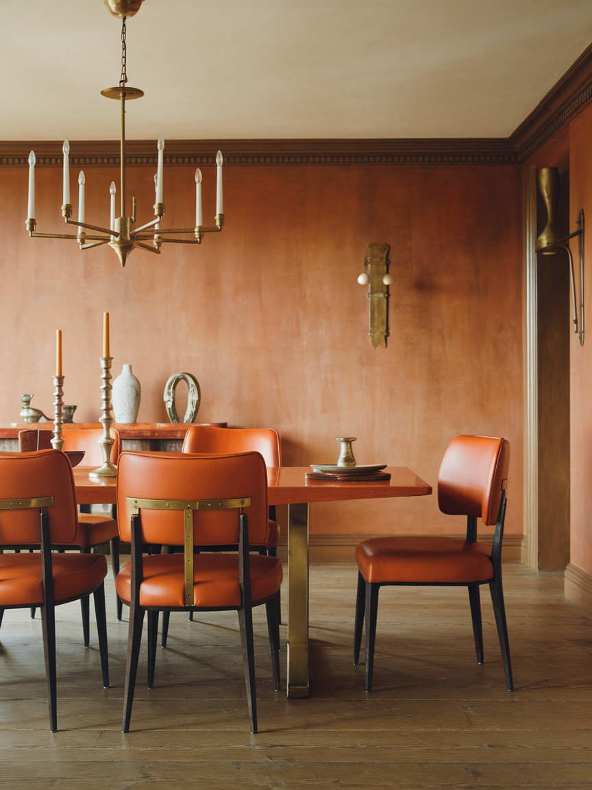Pairing orange with brass accents introduces a touch of luxury and refinement to the dining room. Brass elements, such as lighting fixtures, hardware, or decor, reflect warm tones and enhance the richness of orange hues. The metallic finish adds contrast and visual interest without overpowering the space. To keep the look balanced, limit brass to a few key features, allowing the orange elements to remain the primary source of warmth. This combination creates a polished and timeless aesthetic.