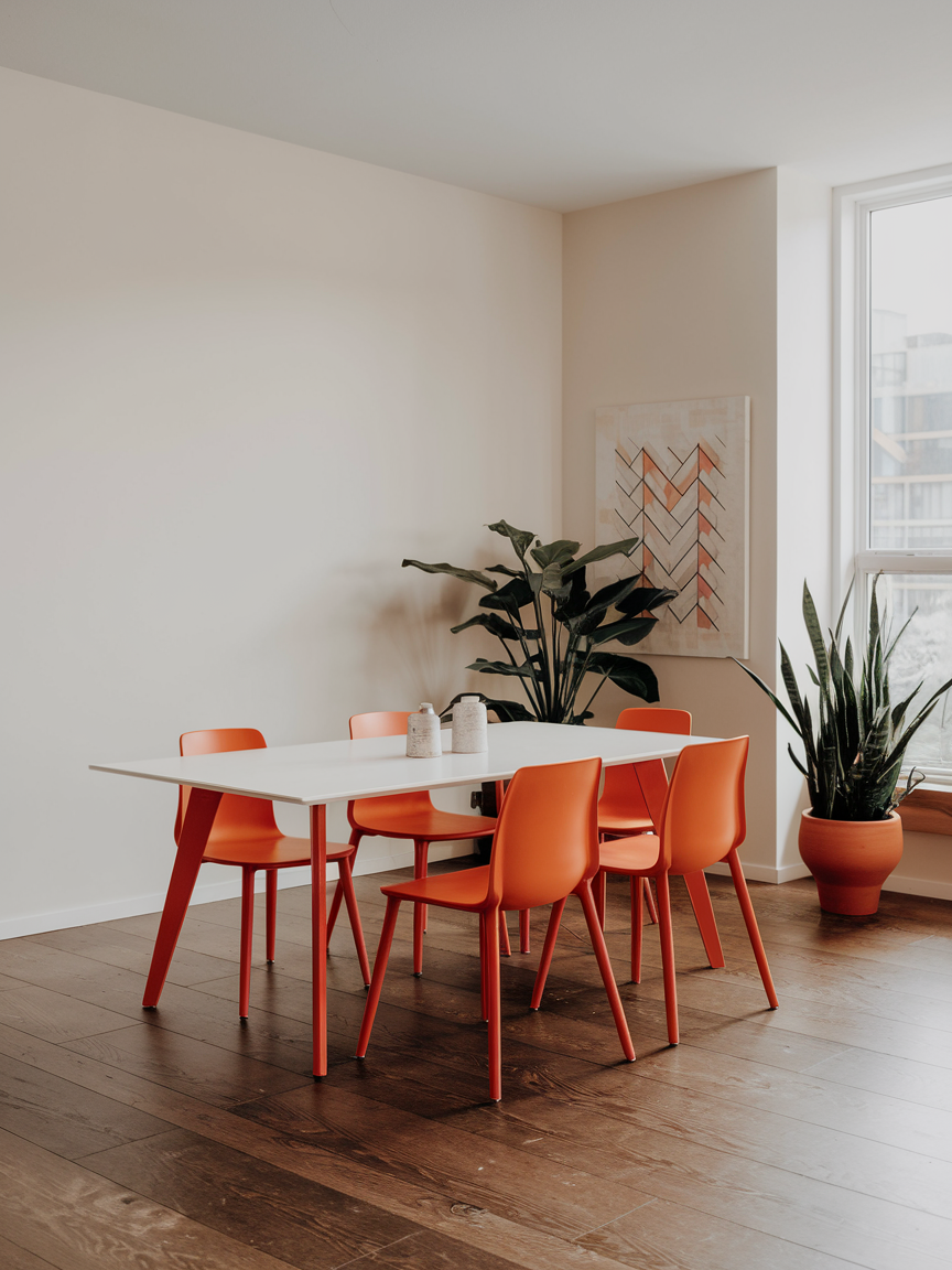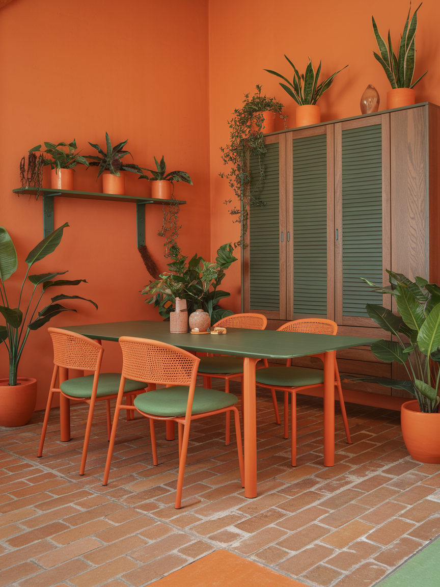 Combining orange tones with greenery creates a balanced and refreshing dining environment. The warmth of orange contrasts beautifully with the coolness of green, resulting in a space that feels lively yet calming. Plants add texture and movement, softening the overall look while enhancing the natural aesthetic. Keeping planters simple ensures the focus remains on the color combination. This pairing brings a sense of vitality and connection to nature into your dining room.