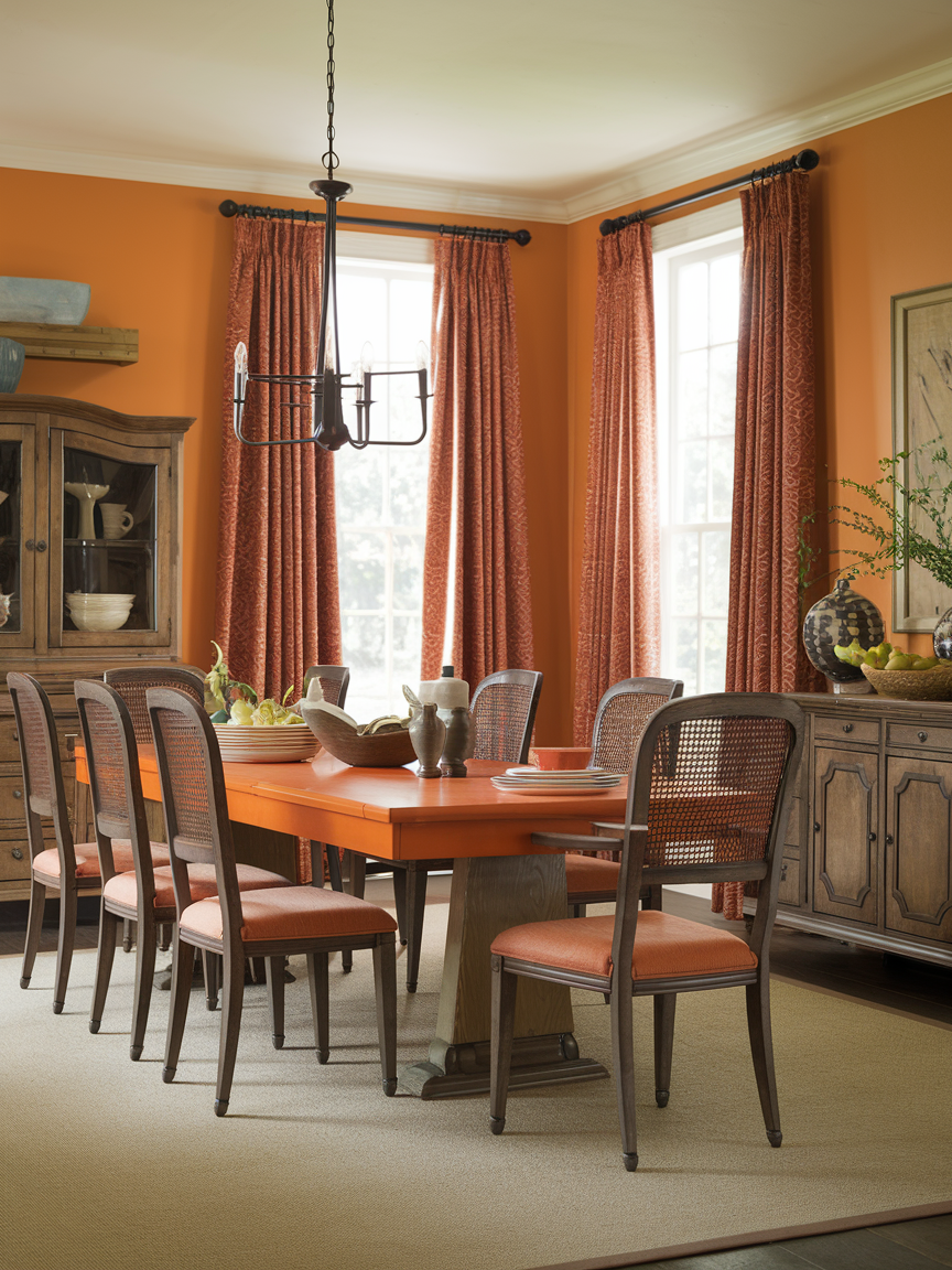 Curtains in rust or burnt orange tones add a soft, elegant layer to your dining room. They frame windows beautifully while contributing to the overall warmth of the space. Fabric curtains also improve acoustics, making conversations feel more intimate. Choosing the right material—lightweight for an airy feel or heavier for a formal look—allows you to tailor the ambiance. Paired with neutral decor, they enhance comfort without overwhelming the room.