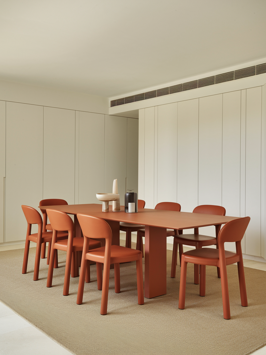 Burnt orange dining chairs instantly introduce richness and depth, making them a striking focal point within a neutral dining space. This deeper variation of orange feels sophisticated rather than loud, especially when paired with materials like dark wood, marble, or matte black finishes. Upholstered chairs enhance comfort while adding texture, making long meals feel more relaxed and enjoyable. To create a harmonious look, repeat the burnt orange tone in subtle ways—through ceramics, artwork, or textiles—so the color feels intentional rather than isolated. This approach ensures the chairs stand out while still blending seamlessly into the overall design, resulting in a space that feels curated, stylish, and thoughtfully composed.