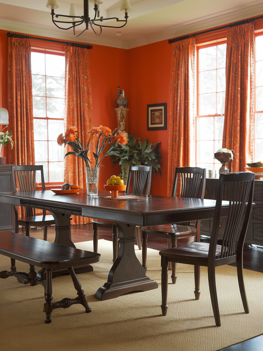 The combination of orange tones and dark wood furniture creates a rich, sophisticated dining room aesthetic. The warmth of orange enhances the depth of darker finishes, resulting in a cozy yet elegant atmosphere. This pairing works particularly well in traditional or transitional spaces, where classic elements meet modern color choices. To avoid the room feeling too heavy, incorporate lighter accents such as neutral upholstery, glass decor, or soft lighting. This contrast adds balance while maintaining the overall warmth and refinement of the space.
