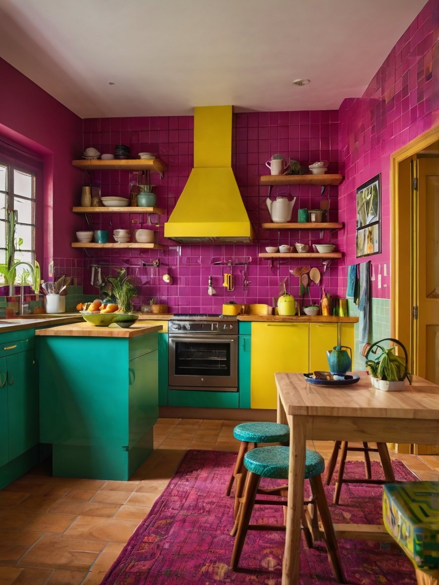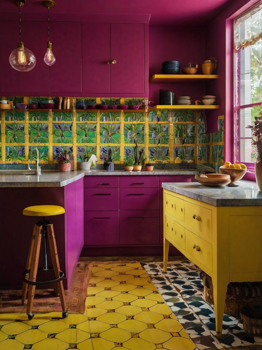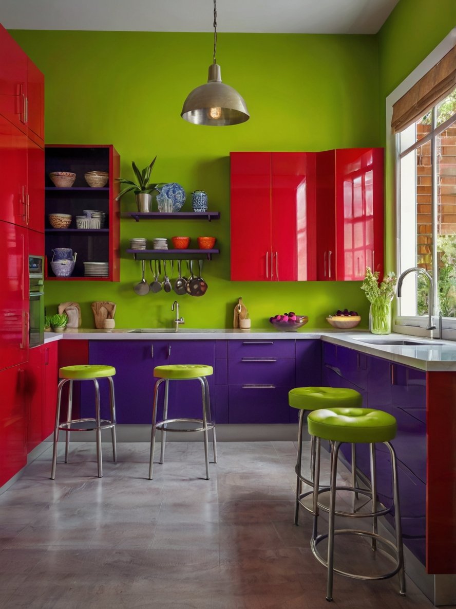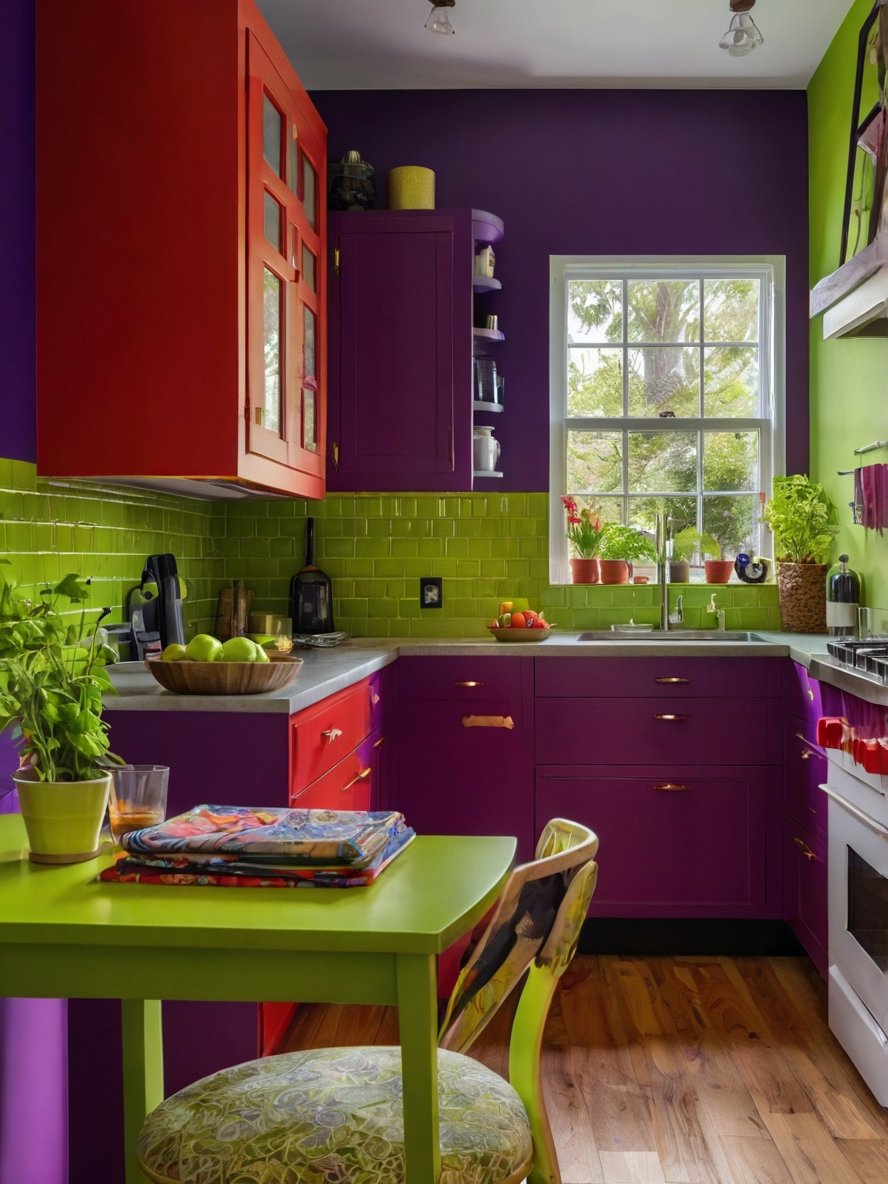 This kitchen is a bold and artistic masterpiece, embracing a vibrant mix of purple, red, and lime green. The deep purple walls create a rich, moody backdrop, while the lime green backsplash and table bring a fresh, energetic contrast. The red cabinets add an additional layer of excitement, making the kitchen feel lively and expressive. This color scheme is fearless and unique, perfect for someone who enjoys maximalist and eclectic design. However, such a bold palette may not be for everyone, as it requires confidence in vibrant aesthetics. Those who prefer neutral or timeless designs might find the combination overwhelming over time.