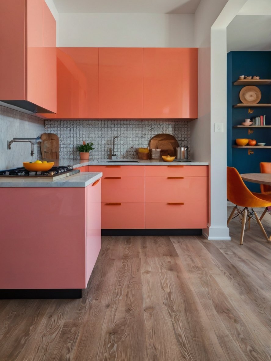 This kitchen embraces a beautiful coral color palette, creating a fresh and uplifting atmosphere. The soft yet vibrant hue of the cabinetry strikes a balance between warmth and modernity, making the space feel inviting. Unlike bolder reds or oranges, coral has a soothing quality, making it a great choice for a kitchen where comfort and energy coexist. The glossy finish enhances light reflection, ensuring the kitchen stays bright and airy. However, coral is a trendy color, meaning it may not have the same longevity as neutral tones. Homeowners who love bold yet elegant spaces will appreciate this aesthetic, while those preferring classic styles may find it too contemporary.