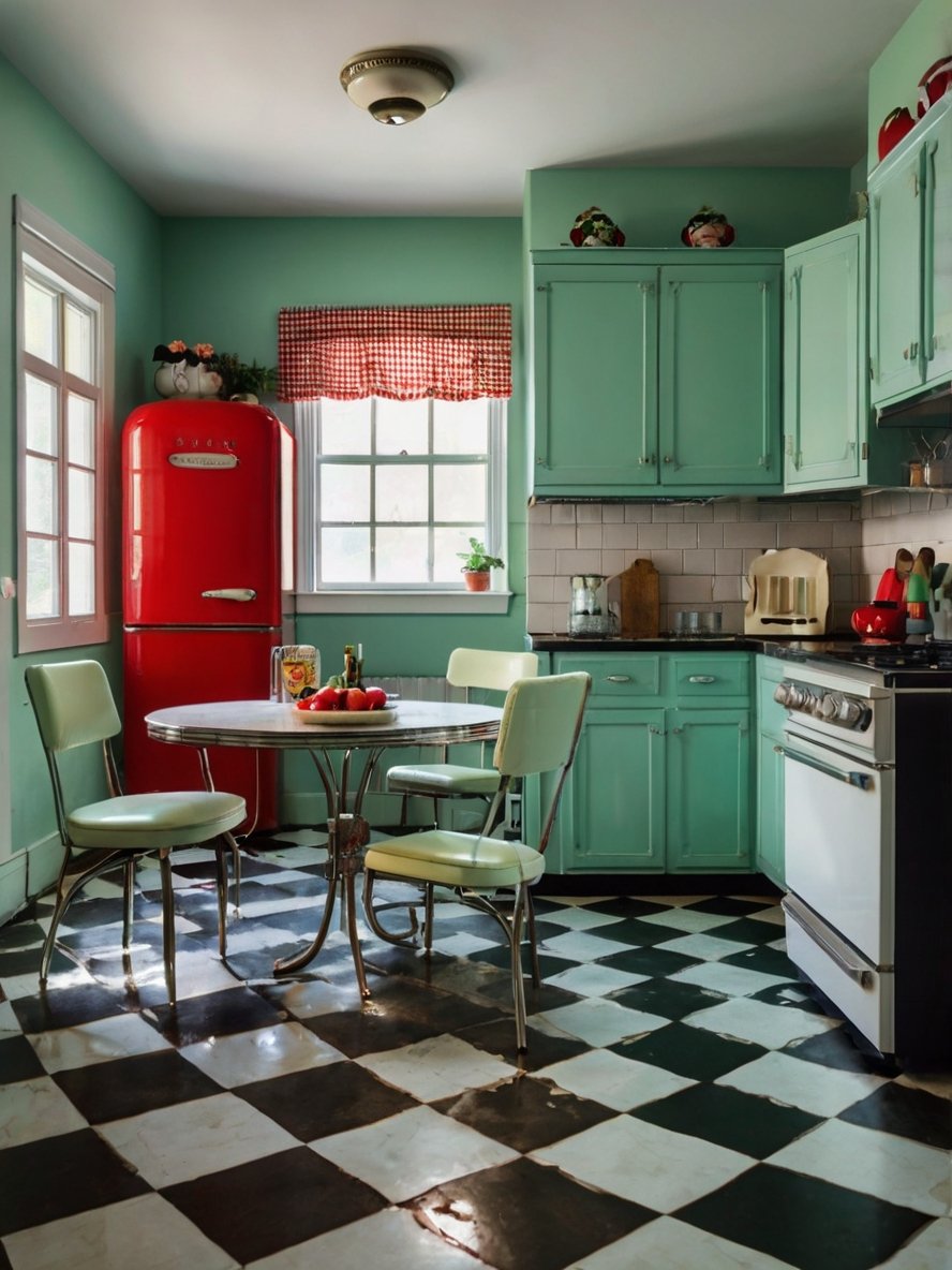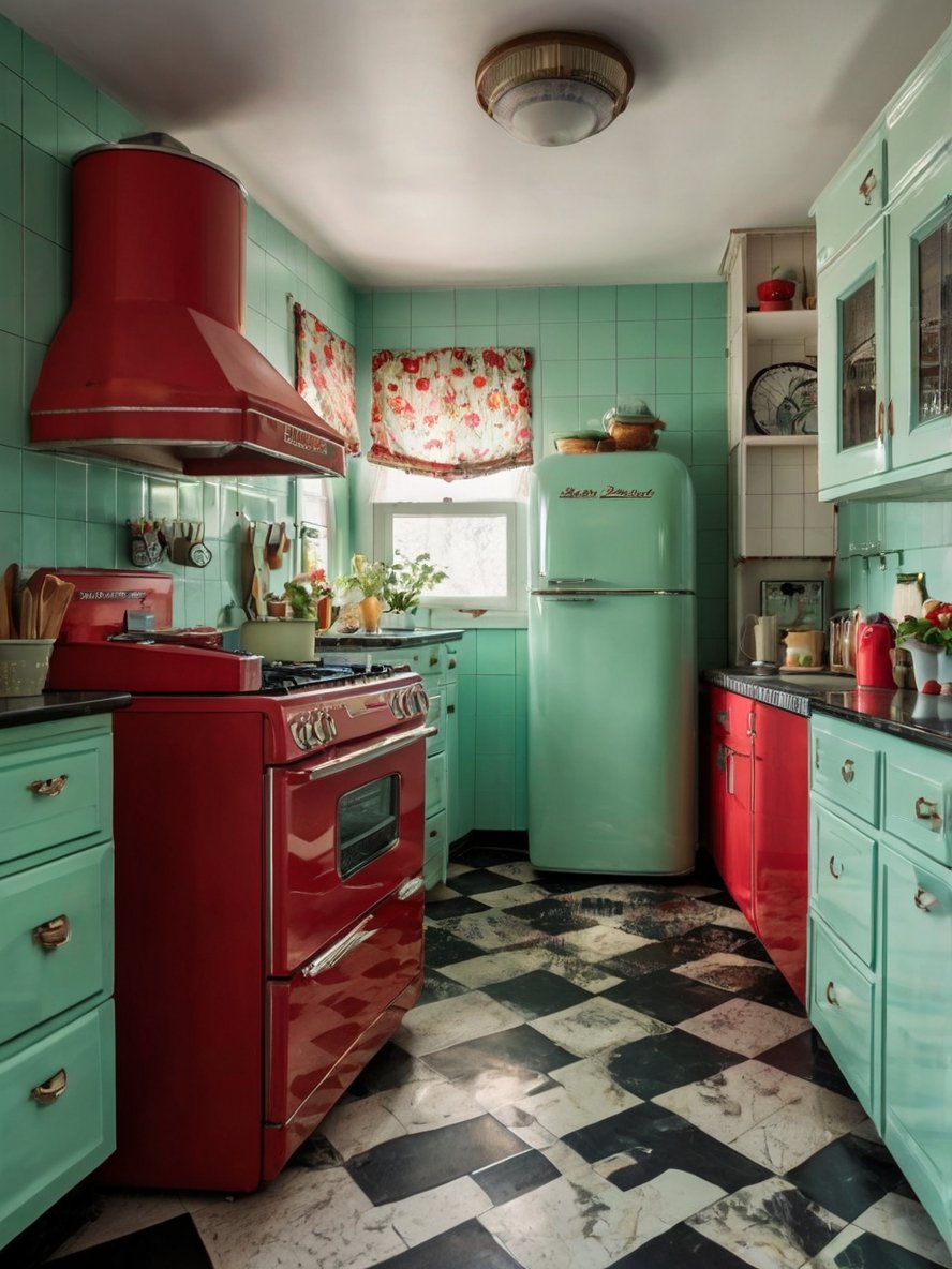 The mint green Big Chill refrigerator and red vintage-style stove are standout pieces that reinforce the kitchen’s nostalgic feel. These appliances not only function as essential cooking elements but also double as decorative focal points. The soft curves and chrome details add to the authenticity of the mid-century aesthetic. While they contribute significantly to the kitchen’s charm, vintage-style appliances can sometimes be less energy-efficient than modern counterparts. Additionally, their bold colors might make it challenging to update the kitchen’s style in the future without requiring a complete overhaul.