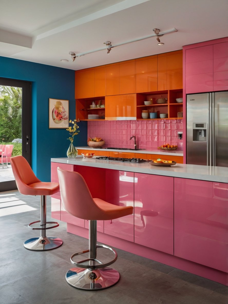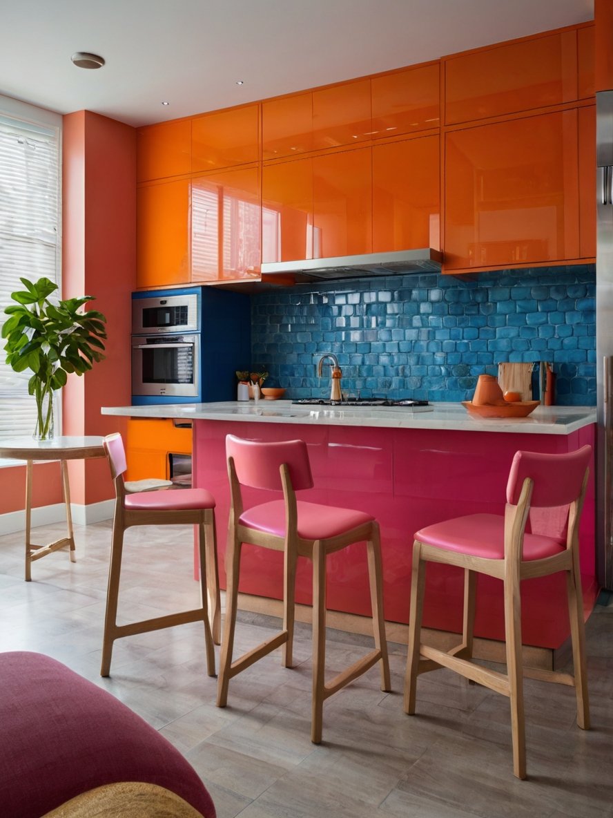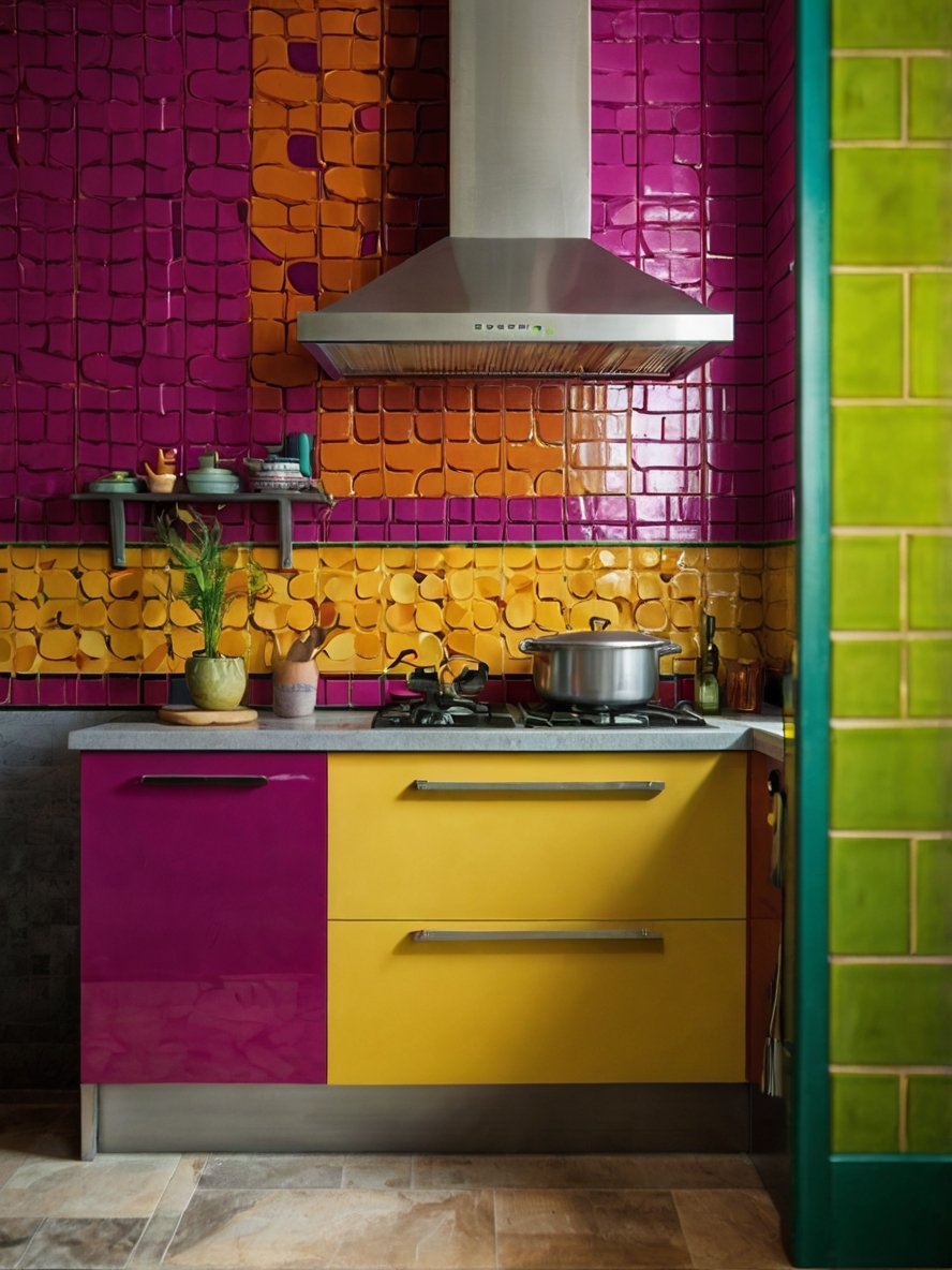 The most striking feature of this kitchen is its three-dimensional glossy wall tiles. The chunky, irregular pattern gives the walls a sculptural quality, adding depth and movement to the space. The reflective surfaces enhance the vibrancy of the magenta and orange tones, making them appear even richer. This tactile and artistic backsplash transforms the kitchen into a statement piece rather than just a functional space. However, highly textured tiles can be challenging to clean, as grease and grime may accumulate in the crevices over time. Regular maintenance and proper sealing would be necessary to preserve their beauty.
