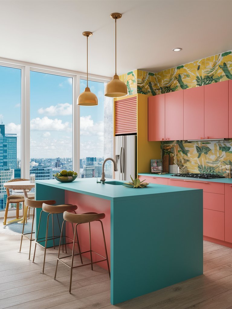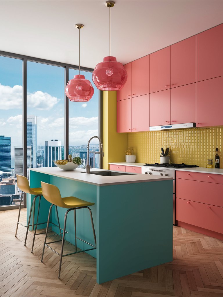 The city view in this kitchen is a breathtaking feature that elevates the overall ambiance, making the space feel expansive and connected to the urban landscape. The floor-to-ceiling windows provide an uninterrupted panorama of the skyline, allowing natural light to flood the kitchen and enhance the vibrancy of its bold color palette. The view creates a sophisticated, modern atmosphere, perfectly complementing the contemporary design. It also serves as a dynamic backdrop, changing throughout the day as the lighting shifts from bright daylight to the golden hues of sunset and the twinkling city lights at night. However, while the open view adds a sense of luxury, privacy could be a concern, especially for high-rise living. Incorporating sheer curtains or smart glass solutions could help balance openness with privacy while maintaining a stunning visual connection to the city.