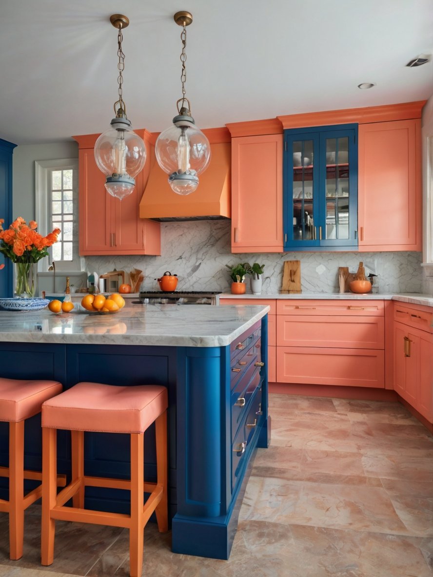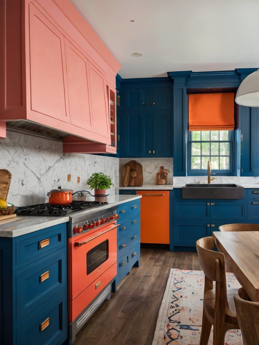 This kitchen embraces a rich and striking color combination, featuring deep navy blue cabinetry, coral upper cabinets, and warm orange accents. The interplay between these colors creates a perfect balance of warmth and depth, making the space feel both inviting and refined. The navy blue base cabinets provide a grounding effect, while the coral upper cabinets introduce a fresh and unexpected contrast. The orange elements, such as the stove and window treatment, add a playful touch, reinforcing the kitchen’s unique personality. While this palette is bold and modern, it might not be universally appealing, as highly saturated colors can feel overpowering for those who prefer neutral tones.