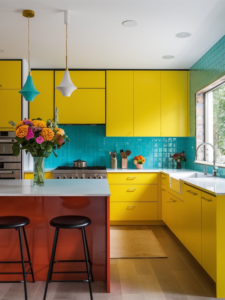 The yellow cabinetry in this kitchen is a bold and energetic design choice that instantly brightens the space. The vibrant hue brings a sense of warmth and playfulness, making the kitchen feel lively and inviting. The flat-panel, handle-free design enhances the modern aesthetic, creating a clean and seamless look. Extending the cabinetry to the ceiling maximizes storage while maintaining a clutter-free appearance. The yellow tone pairs beautifully with the turquoise backsplash, adding depth and contrast. However, such a bold color may not appeal to everyone, as it requires commitment to a high-energy design. Over time, prolonged exposure to sunlight could cause some fading, necessitating maintenance. Despite this, the cabinetry makes a strong statement and adds personality to the space.