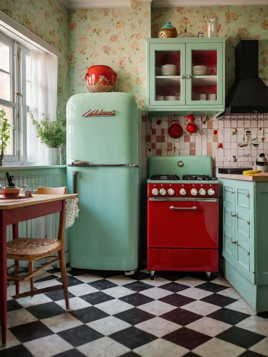 This kitchen exudes vintage charm through its soft mint green cabinetry, a pastel floral wallpaper, and bold red accents. The combination of cool and warm tones creates a visually exciting contrast that feels both playful and cozy. The retro-style mint refrigerator and red stove serve as statement pieces, reinforcing the nostalgic feel. The use of black-and-white checkered flooring adds a classic touch that enhances the retro diner aesthetic. While this palette is highly stylized and unique, it may not suit those who prefer neutral or contemporary designs. However, for vintage lovers, this kitchen is a perfect balance of softness and boldness.
