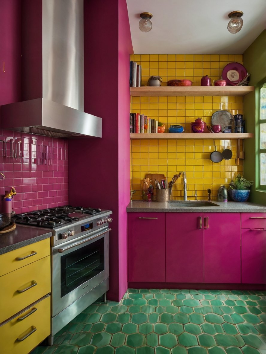 The stainless steel range and hood provide a sleek, industrial contrast to the vibrant colors in the kitchen. The metallic finish adds a modern touch while balancing out the warmth of the magenta and mustard hues. The large range ensures high functionality, making this kitchen not just visually stunning but also highly practical for serious cooking. The sleek vent hood complements the industrial look, creating a focal point without competing with the bold cabinetry. However, stainless steel can be prone to fingerprints and smudges, requiring frequent cleaning to maintain its polished appearance.