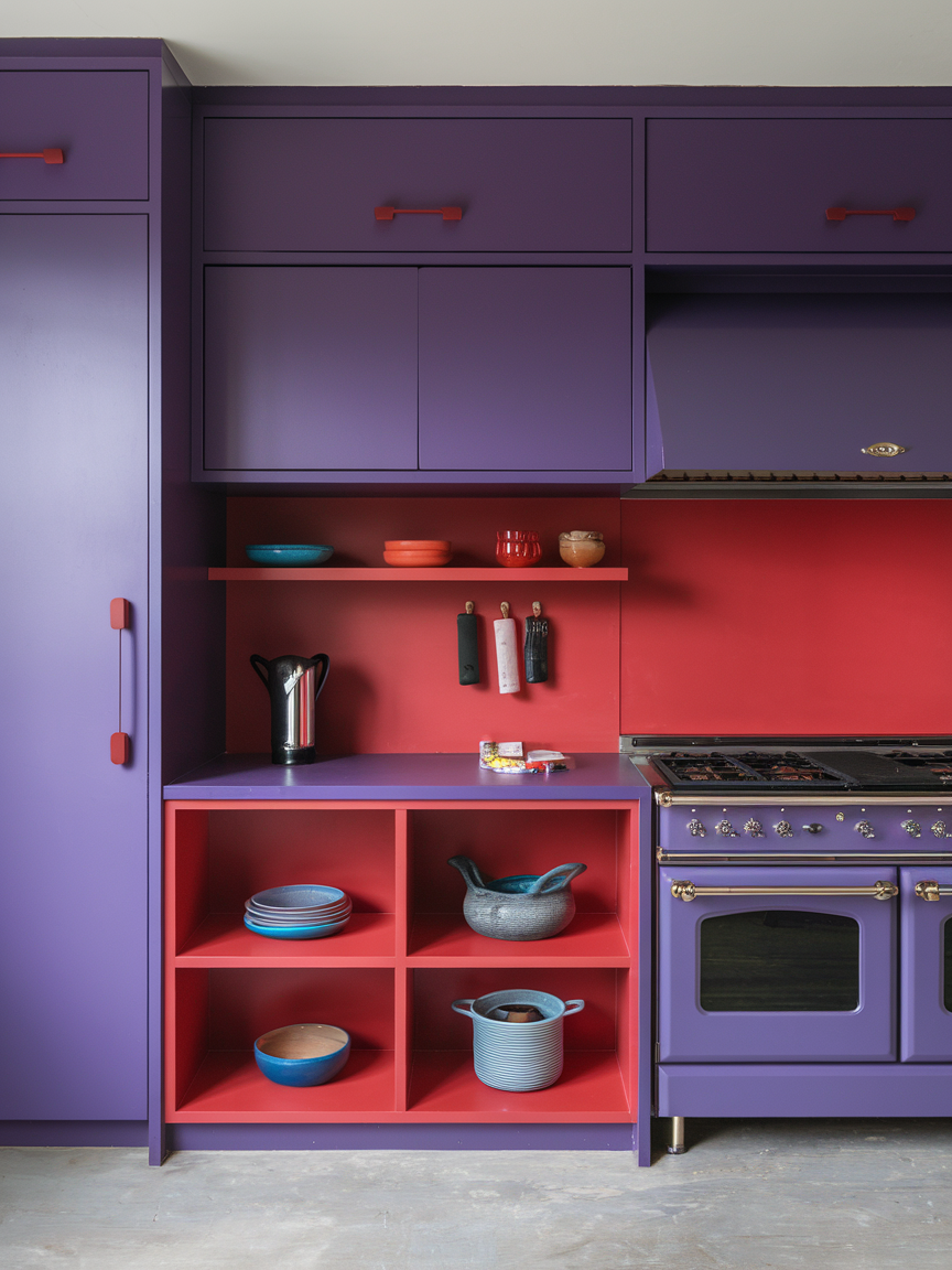 The cabinetry follows a sleek, modern design with clean lines and a handleless finish that keeps the look contemporary. The upper cabinets are a deep purple, blending seamlessly into the surrounding wall, while the lower section features a red open shelving unit that adds contrast and visual interest. This design choice makes the kitchen feel dynamic and allows for an interplay of colors without overwhelming the space. However, open shelving, while stylish, requires frequent upkeep to maintain a neat appearance. Dust and grease buildup can become an issue, especially in a busy kitchen environment, making this setup more suitable for those who enjoy regular organization.