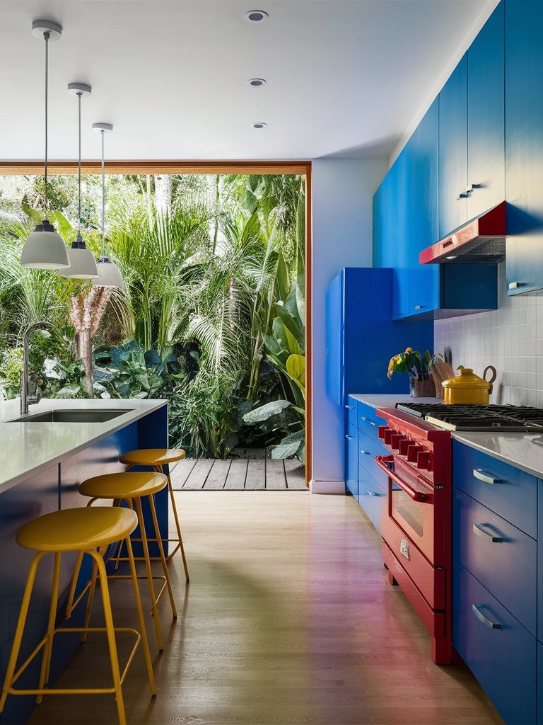 One of the standout features of this kitchen is its strong connection to nature. The large floor-to-ceiling glass door opens up to a lush tropical garden, blurring the lines between indoor and outdoor living. This feature brings in ample natural light, making the colors appear even more vibrant and enhancing the overall freshness of the space. The greenery acts as a natural backdrop, softening the bold interior colors and creating a sense of tranquility. However, maintaining such a large glass opening may require frequent cleaning, and privacy could be a concern, especially in urban settings.
