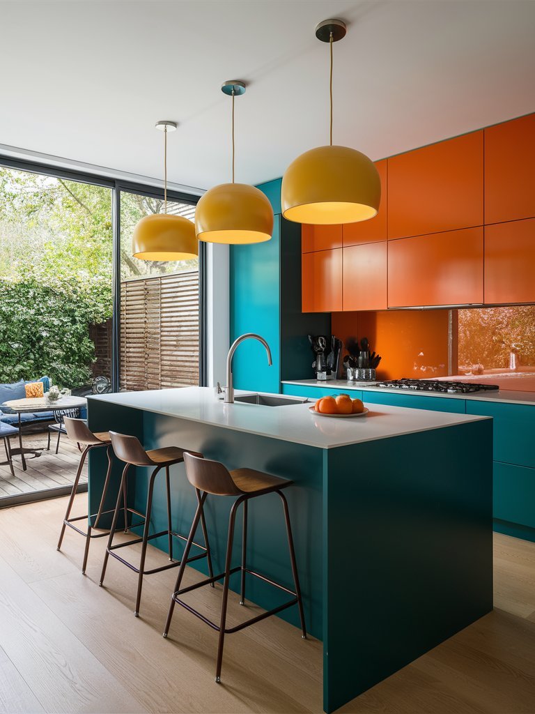 This kitchen features a vibrant and high-energy color scheme, with sunny yellow cabinets, a rich orange island, and a bright teal backsplash. The combination of warm and cool tones creates a dynamic contrast, making the kitchen feel lively and inviting. The yellow cabinets bring warmth and cheerfulness, while the orange island adds a bold statement. The cool teal backsplash balances the intensity, ensuring the space doesn’t feel too overwhelming. While this color palette is fun and modern, it may not appeal to those who prefer timeless neutrals. Homeowners must be confident in their love for bright colors, as this scheme is a strong commitment.
