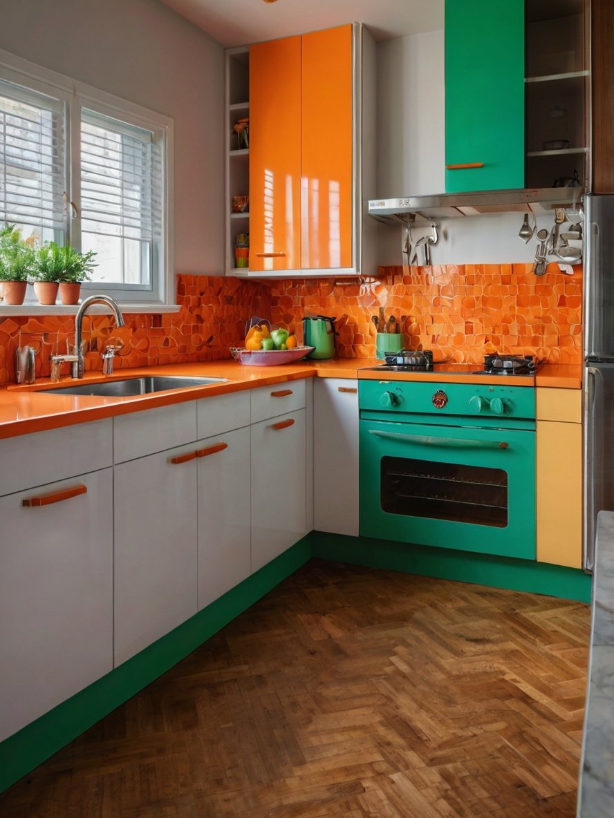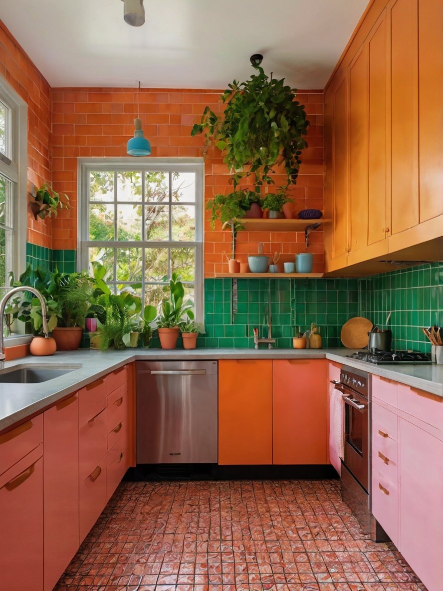 The combination of different tile styles and colors adds depth and texture to this kitchen. The upper walls feature glossy orange subway tiles, while the backsplash is made of striking emerald green tiles. These choices give the kitchen a layered look, with a rich visual complexity that feels dynamic rather than overwhelming. The floor tiles also contribute to the overall effect, showcasing an intricate pattern in a warm, earthy hue that ties into the overall scheme. This blend of textures not only enhances the dopamine effect but also adds a handcrafted, artisanal feel to the space. The high-gloss finish of the tiles further helps reflect natural light, making the kitchen appear even brighter.