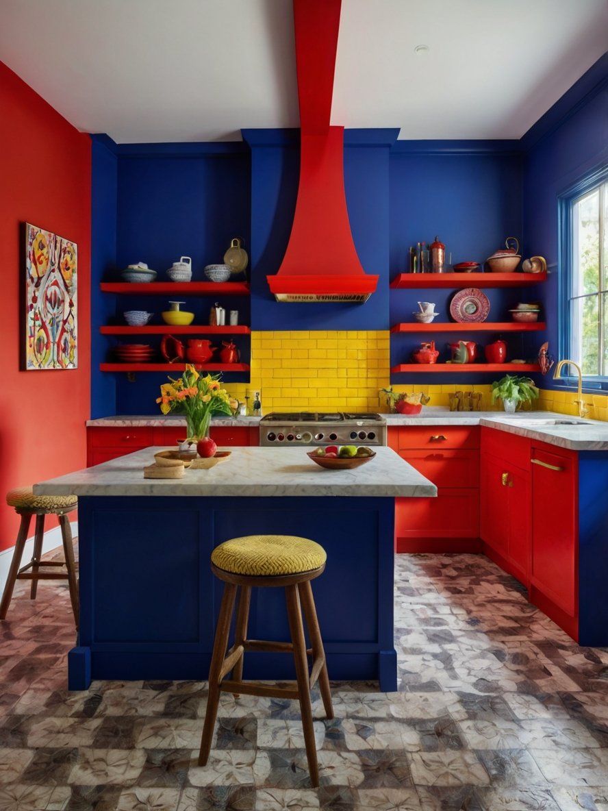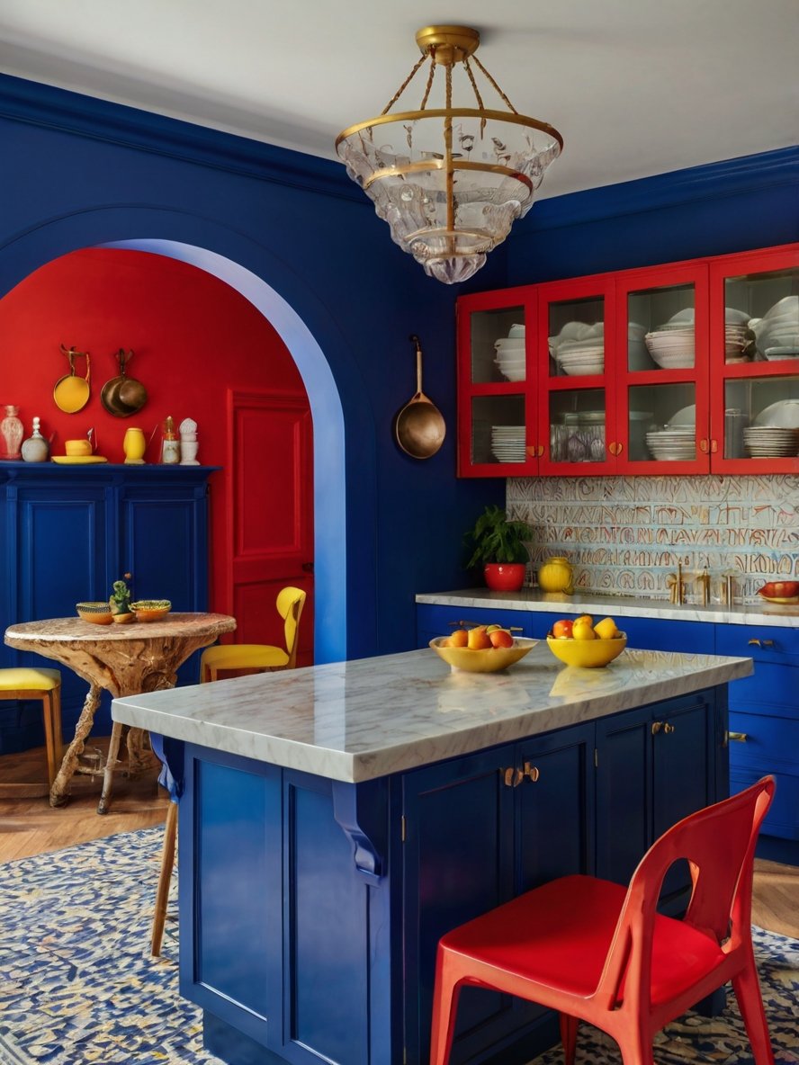 This kitchen is a masterclass in bold color blocking, featuring a striking mix of deep royal blue, fiery red, and sunshine yellow. The high-contrast palette evokes a sense of energy and playfulness, perfectly in tune with dopamine decor principles. The dominance of blue grounds the space, while the red accents add warmth and drama. Yellow highlights provide an unexpected burst of cheerfulness, preventing the design from feeling too intense. This primary color scheme is daring yet balanced, making the kitchen feel both sophisticated and dynamic. The strong color choices create a space that feels full of life, instantly lifting the mood and encouraging creativity.