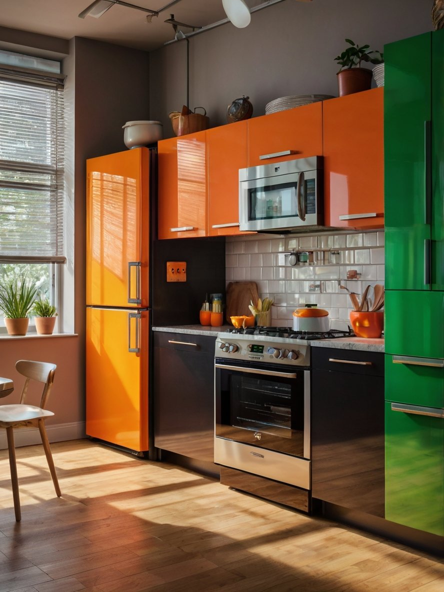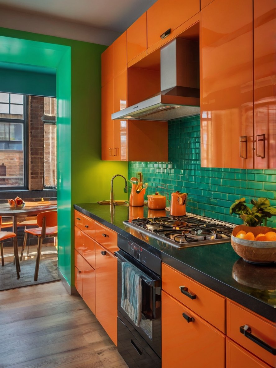 This appliance choice reinforces the overall color scheme while providing a charming focal point that feels both functional and decorative. The contrast between the green oven and the surrounding orange countertops makes this area of the kitchen especially eye-catching, further enhancing the space’s playful and expressive nature.