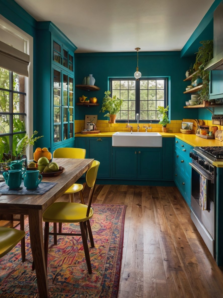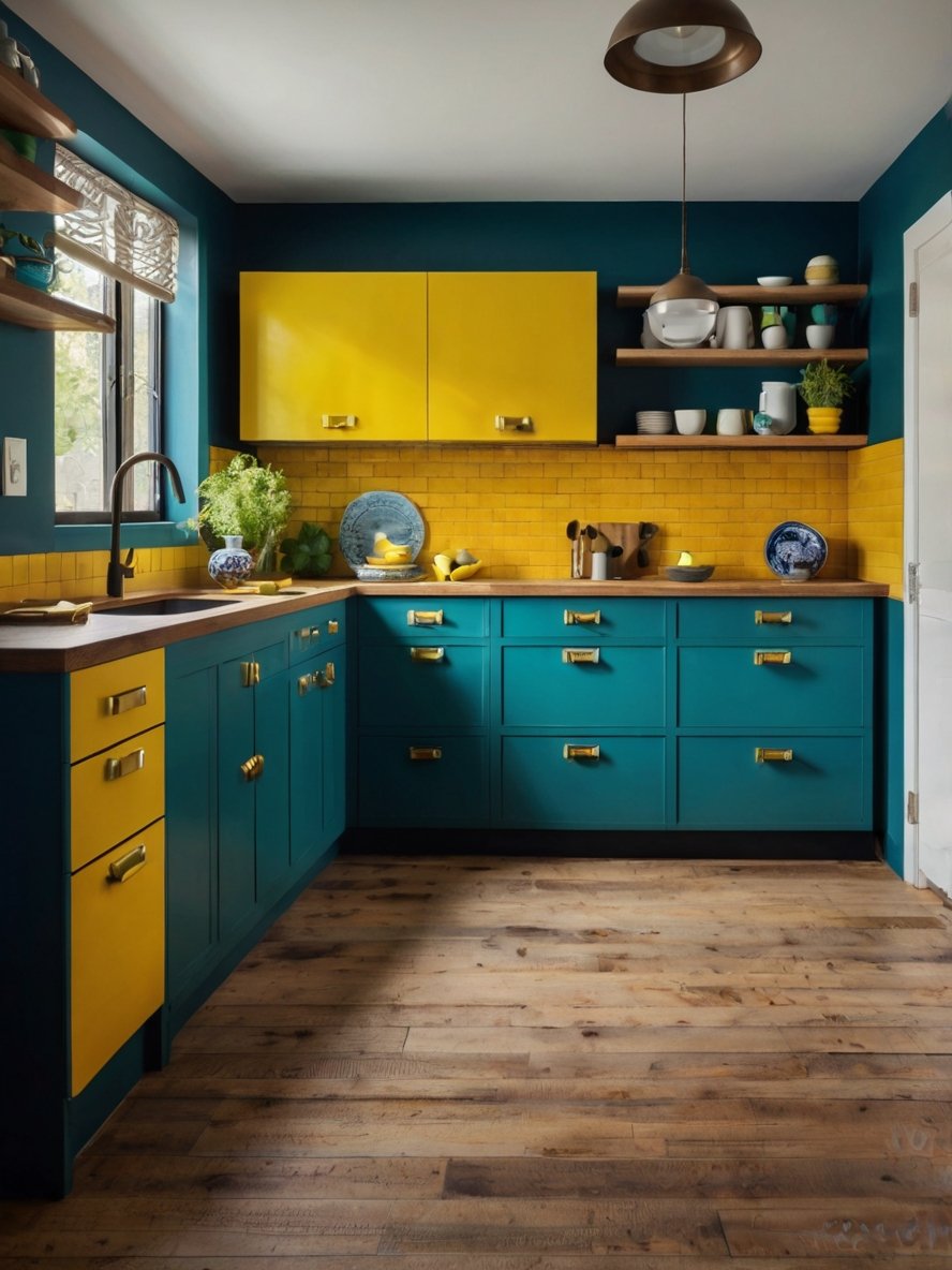 The most eye-catching aspect of this kitchen is its fearless use of color. The deep teal lower cabinets provide a rich, moody foundation, while the mustard yellow upper cabinets and backsplash introduce a bright and cheerful contrast. This combination is both unexpected and dynamic, creating an uplifting and visually engaging atmosphere. The interplay of cool and warm tones keeps the space balanced—teal adds depth and sophistication, while yellow injects a sense of energy and optimism. This kitchen perfectly embodies the dopamine decor trend by using color to create a space that sparks joy and creativity.